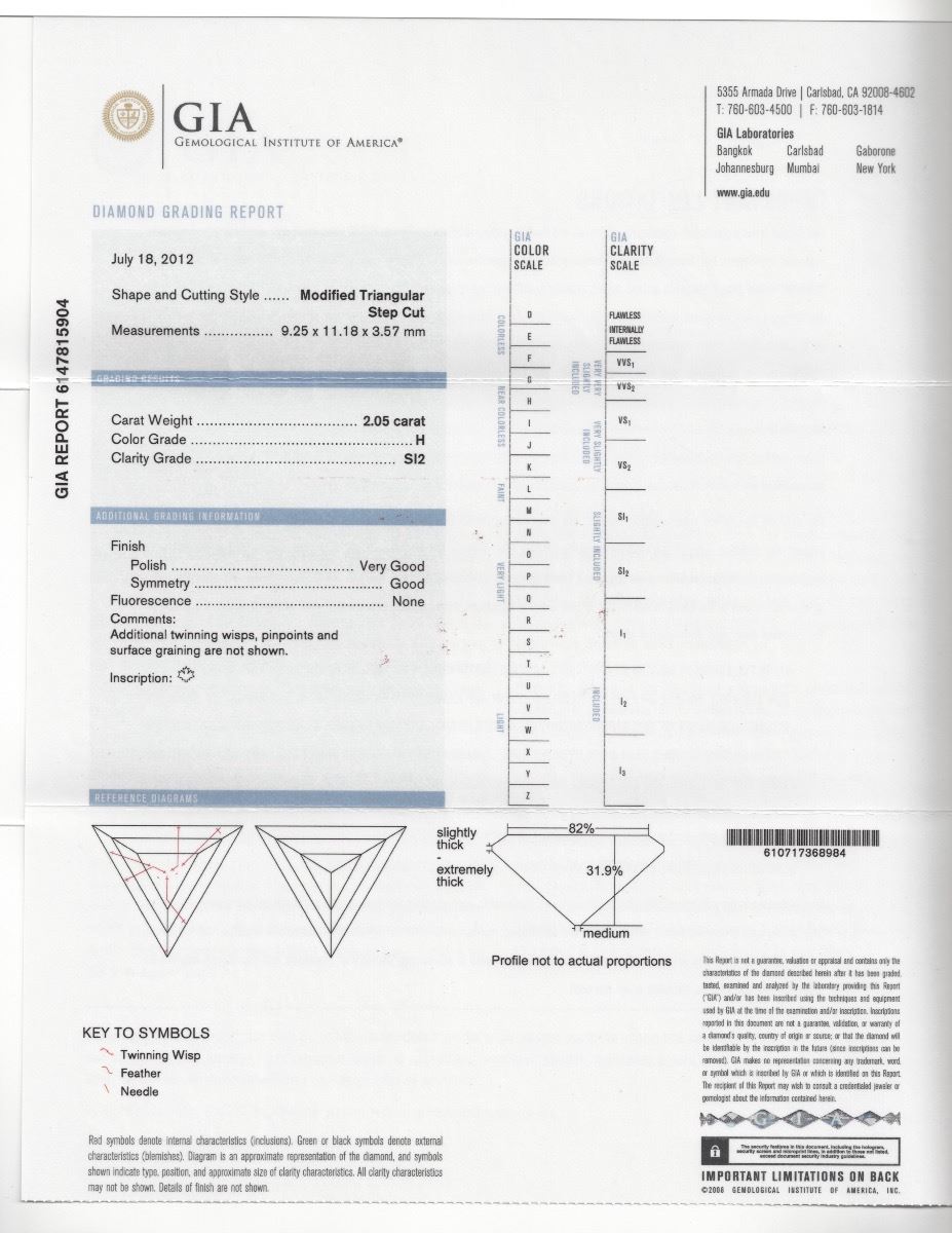 This Step Cut Triangular Shaped Diamond is 2.05cts., SI2, G. GIA CERTIFIED!!!