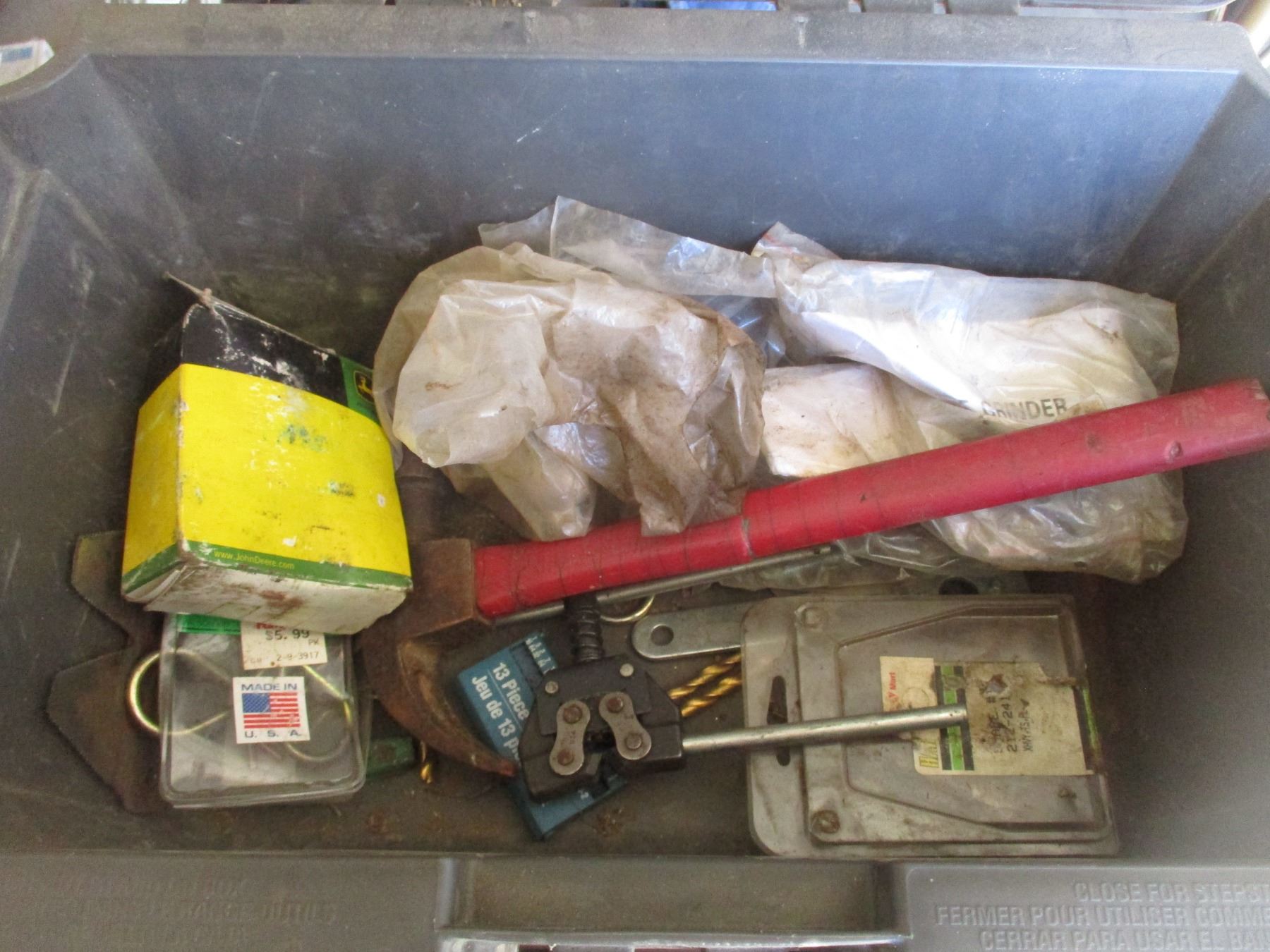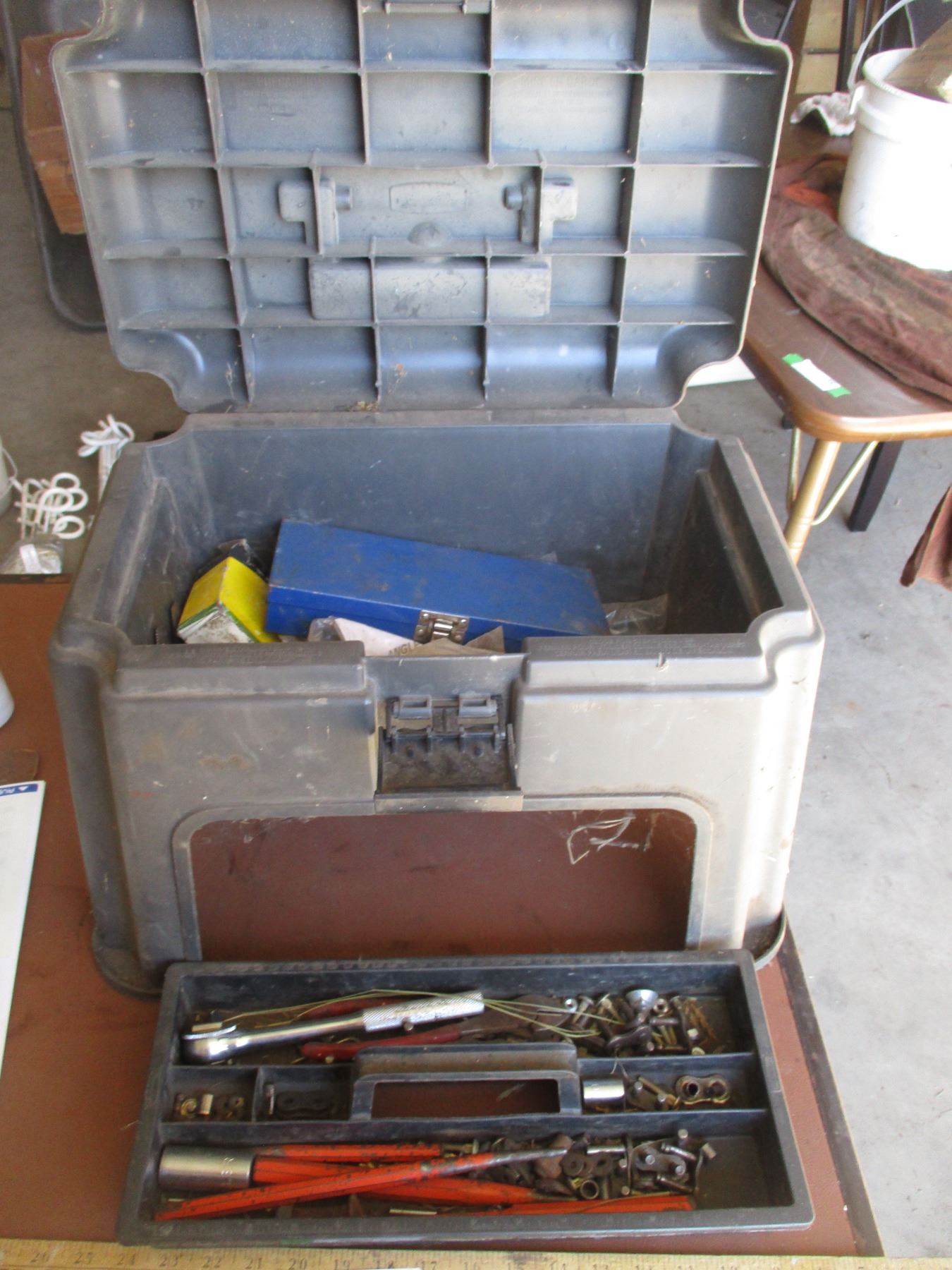 Step Stool With Enclosed Tool Box, Hitch Pins, Claw Hammer, Sockets, etc.
