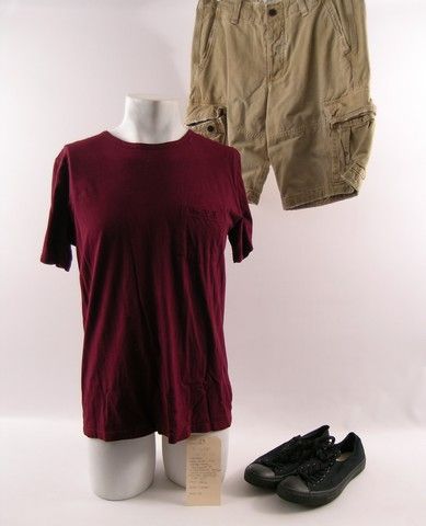 Sean (Ryan Guzman) screen worn, hero, maroon short sleeve one pocket 'Industry of All Nations' t-shirt, (size M) tan with cargo pockets 'Abercrombie and Fitch' shorts, (size 33) and black with black laces 'Converse' shoes. Includes wardrobe tag!