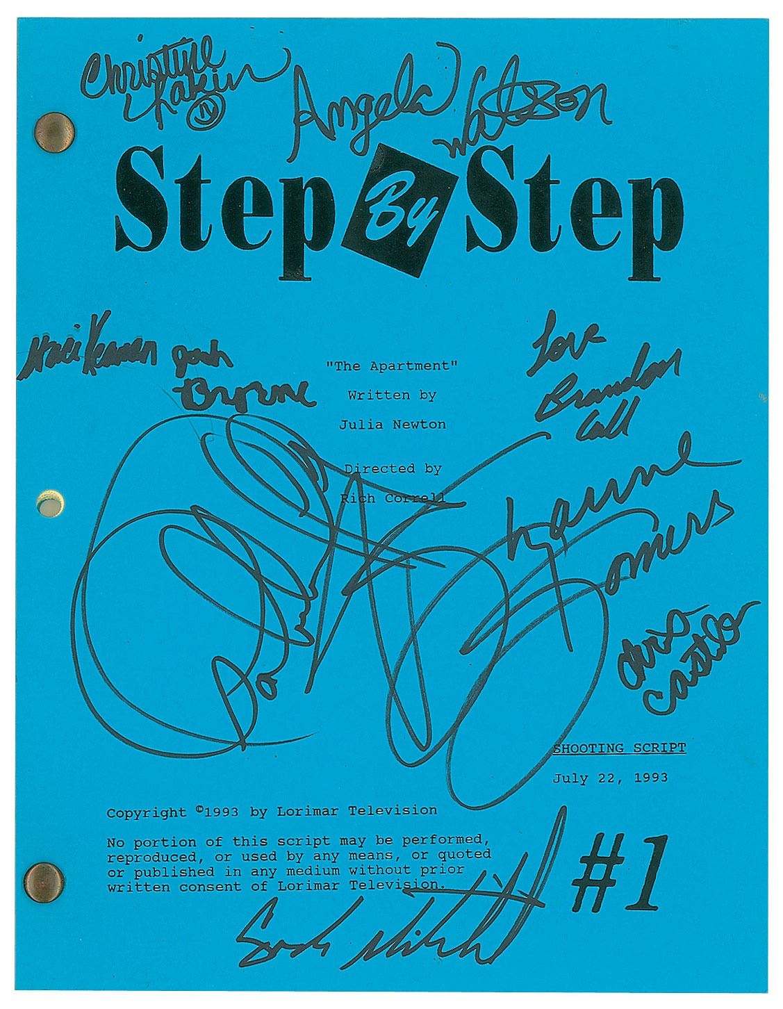 Brad-bound shooting script for the Step by Step episode 'The Apartment,' season three, episode two, 43 pages, 8.5 x 11, dated July 22, 1993, signed on the front cover in black felt tip by Patrick Duffy, Suzanne Somers, Staci Keanan, Sasha Mitchell, Brandon Call, Angela Watson, Christine Lakin, Christopher Castile, and Josh Byrne. In fine condition.