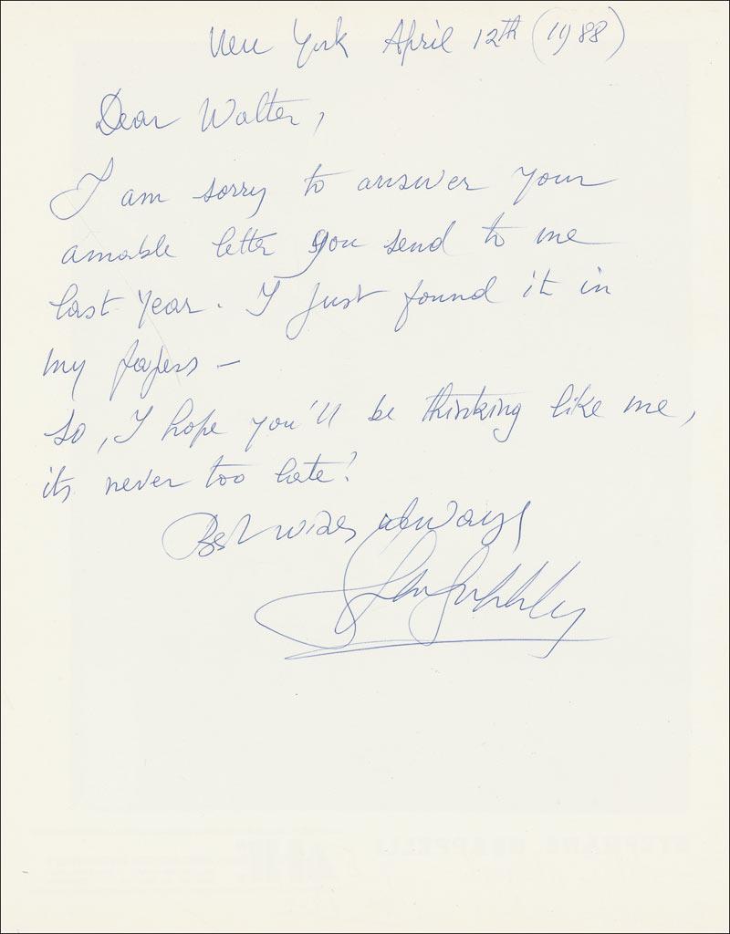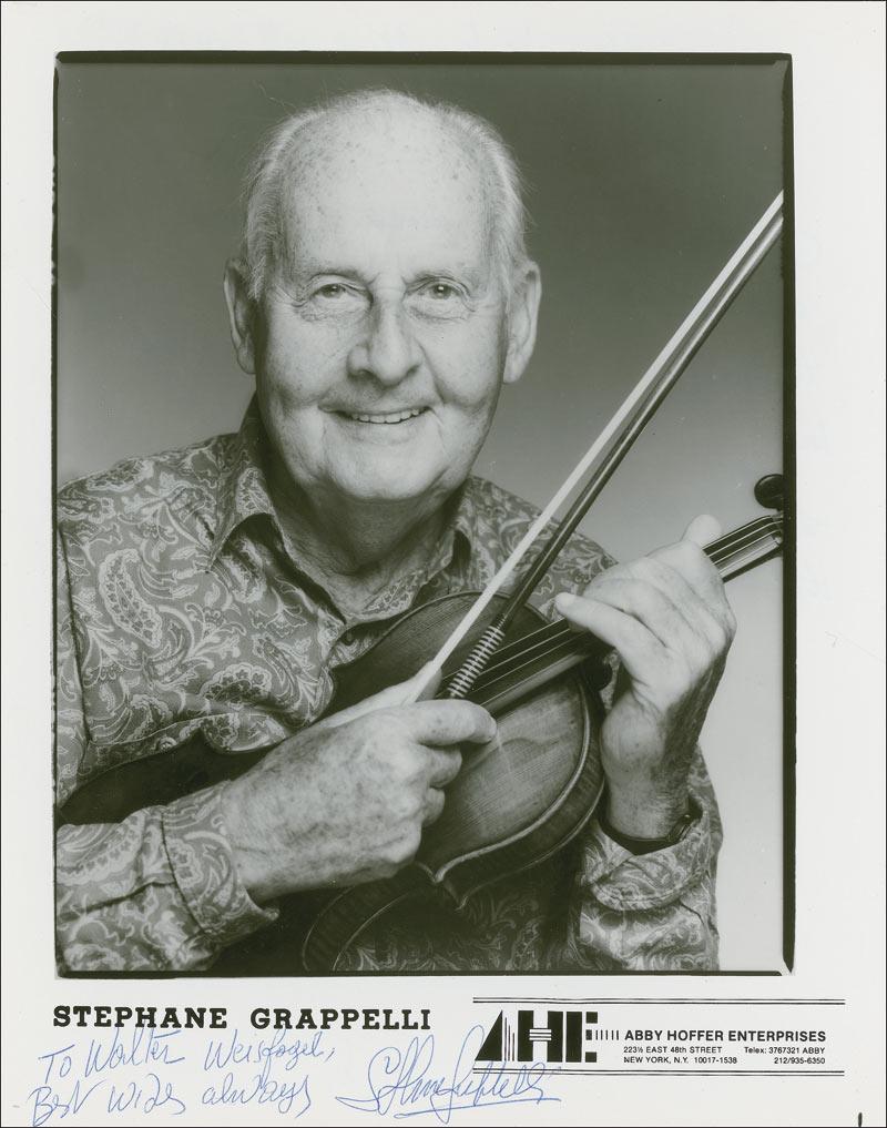 French jazz violinist (1908-1997). Glossy 8 x 10 promotional photo, signed and inscribed in blue ballpoint “To Walter Weisfogel, Best wishes always, Stephane Grappelli.” On the reverse, Grappelli writes an apologetic ALS to the photo’s recipient, dated April 12, 1988, and signed at the conclusion by Grappelli. In fine condition, with a couple small fingerprints and surface marks, and light overall impressions from letter on reverse.