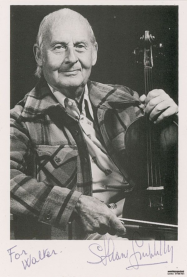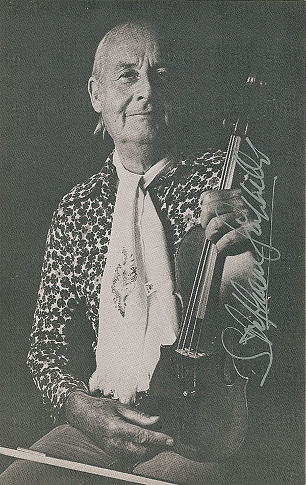 Two postcard photos, each approximately 3.75 x 6, one signed in silver ink, and the other signed and inscribed in ballpoint, “For Walter, Stephane Grappelli.” In fine condition. Both accompanied by their original mailing envelope.