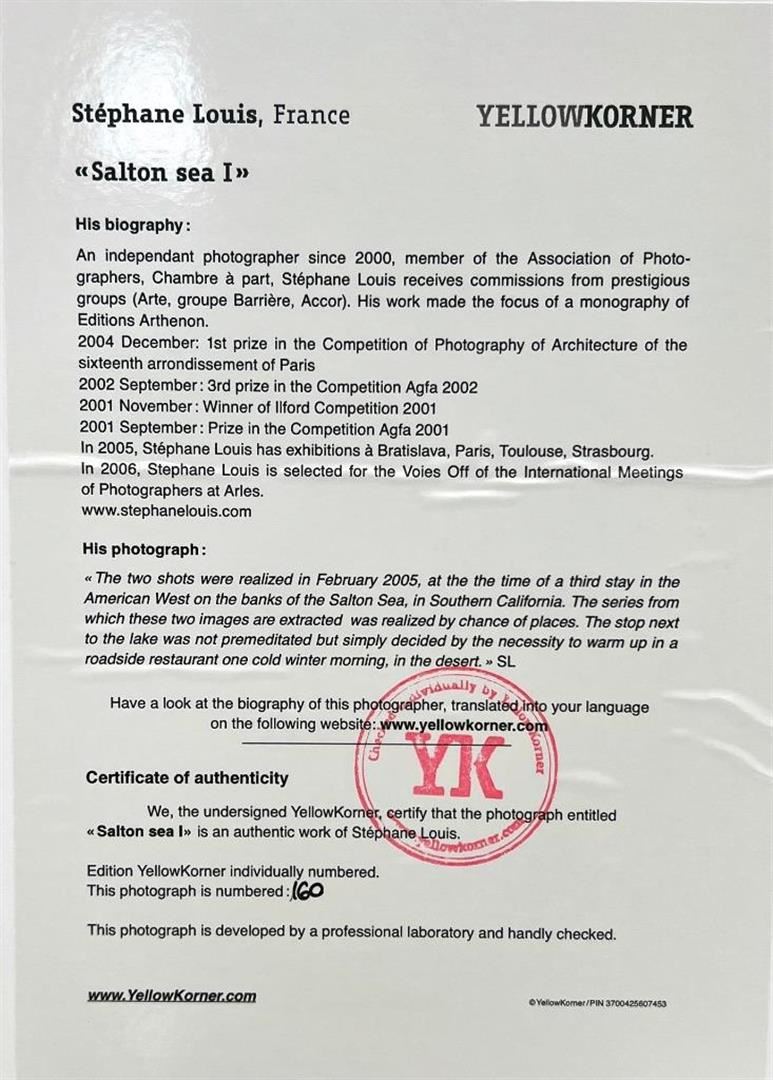 Stephane Louis France Salton Sea I YellowKorner Certified Photograph. Certificate of Authenticity from YellowKorner affixed to the back. Matted Dimensions 16"x20". Protected with Clear Mylar Sleeve.