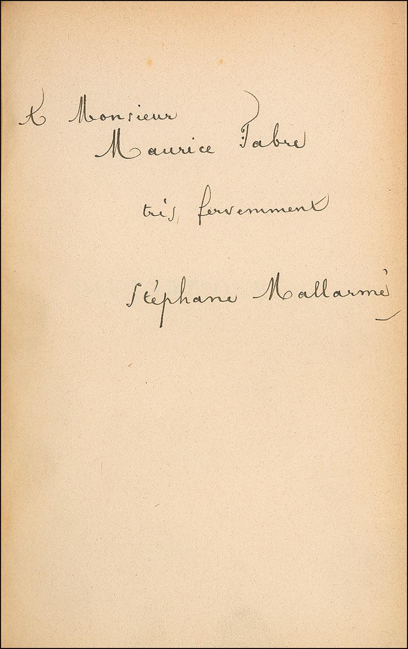 French poet and critic (1842-1898). He was a major French symbolist poet, and his work anticipated and inspired several revolutionary artistic schools of the early 20th century, such as Dadaism, Surrealism, and Futurism. Signed book: Divagations. First edition, first printing. Paris: Bibliotheque-Charpentier, 1897. rebound hardcover, 4.75 x 7.25, 374 pages. Signed and inscribed on the second free end page, in French (translated): “To Monsieur Maurice Fabre, a vivid tribute from Stéphane Mallarmé. ” In very good condition, with toning to all inside pages, and some scattered light soiling and rubbing to boards and spine. Provenance: library of Pierre Dauzier, former CEO of the Havas Group (a French advertising company).