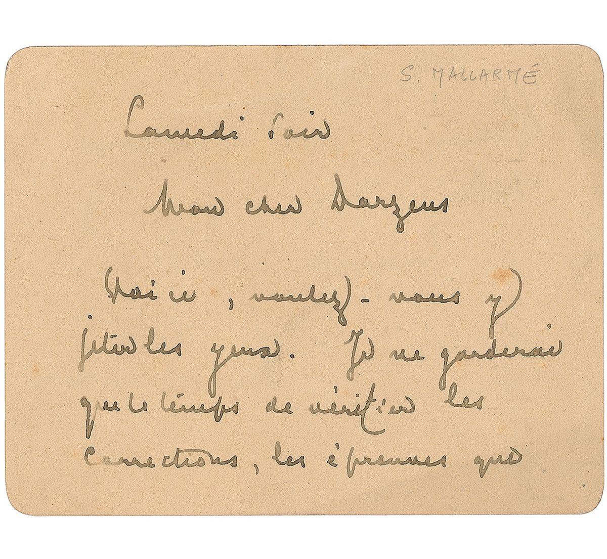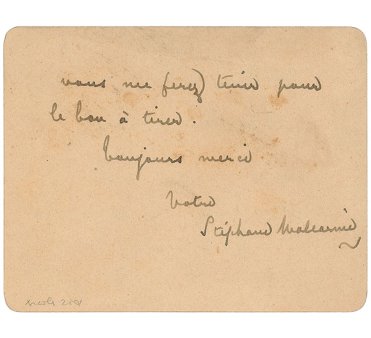 Major French symbolist poet and critic (1842–1898) whose work anticipated and inspired several revolutionary artistic schools of the early 20th century, such as Dadaism, Surrealism, and Futurism. ALS in French, one page both sides, 4.5 x 3.5, no date. Untranslated letter to Rodolphe Darzens on correcting some proofs. Some scattered staining, otherwise fine condition.