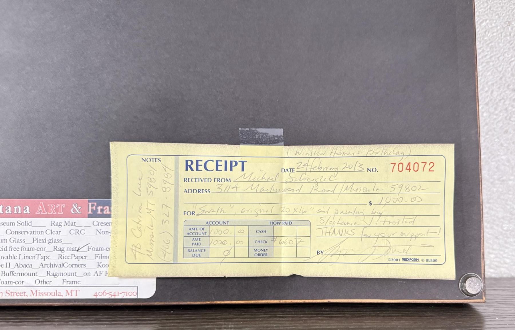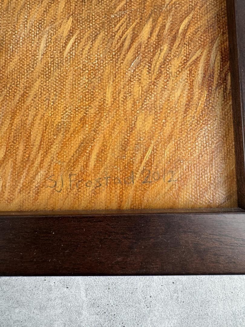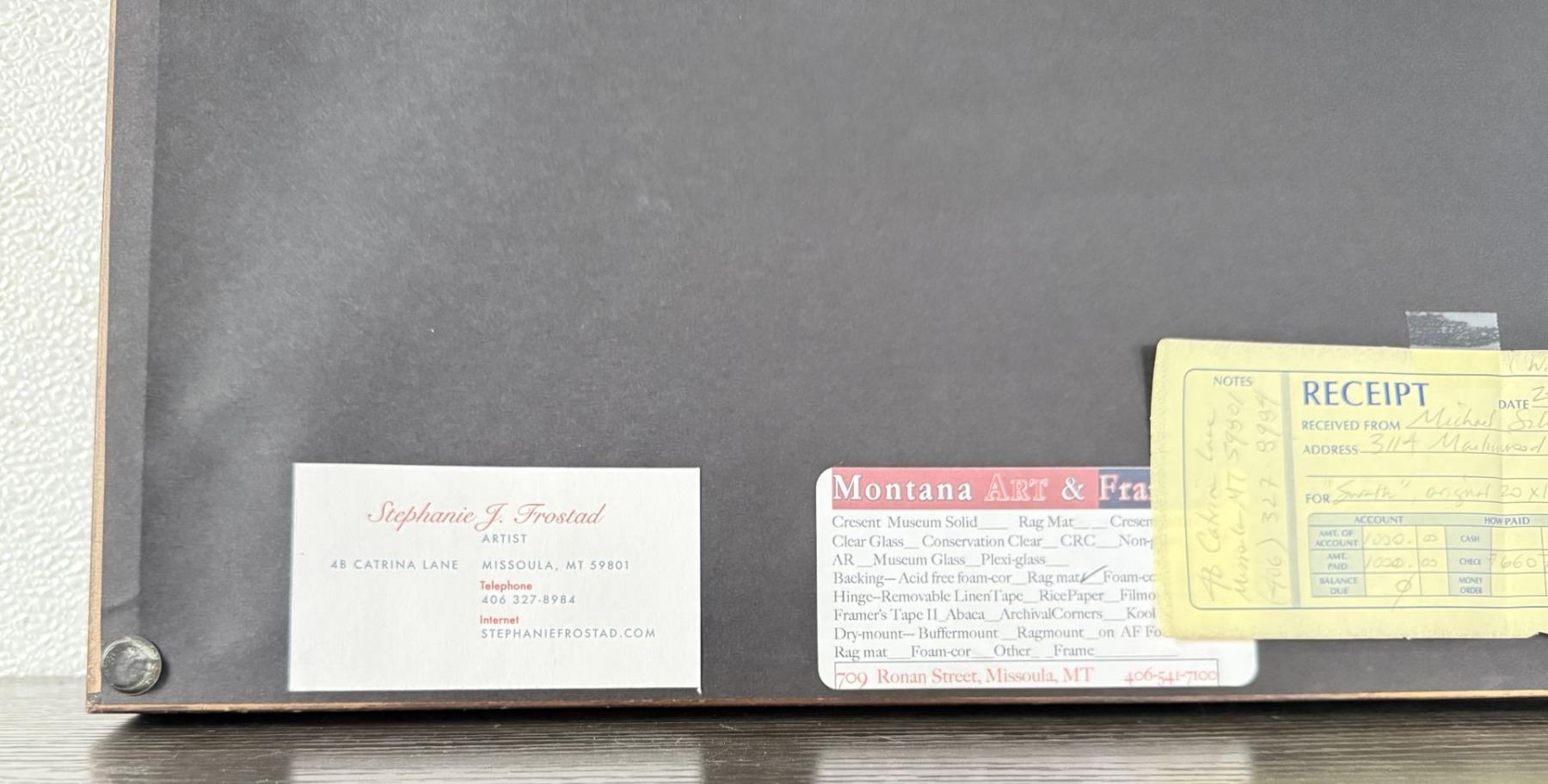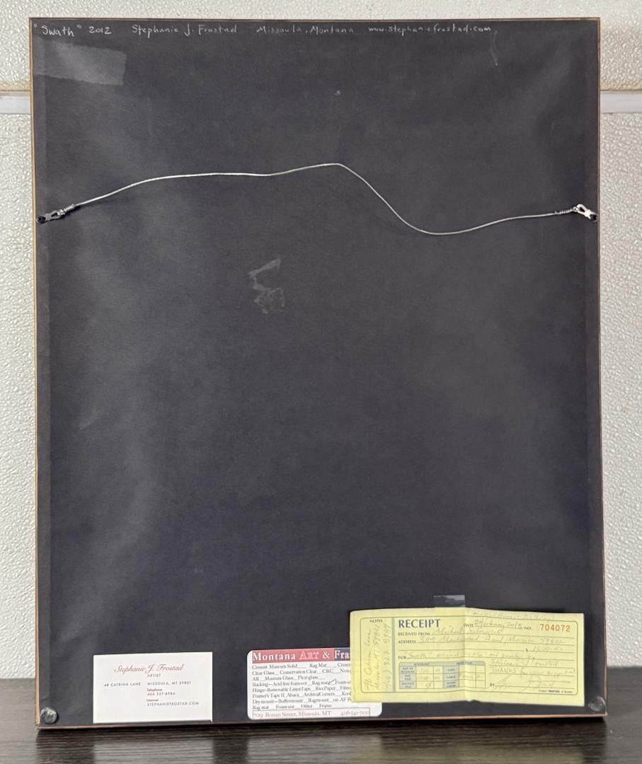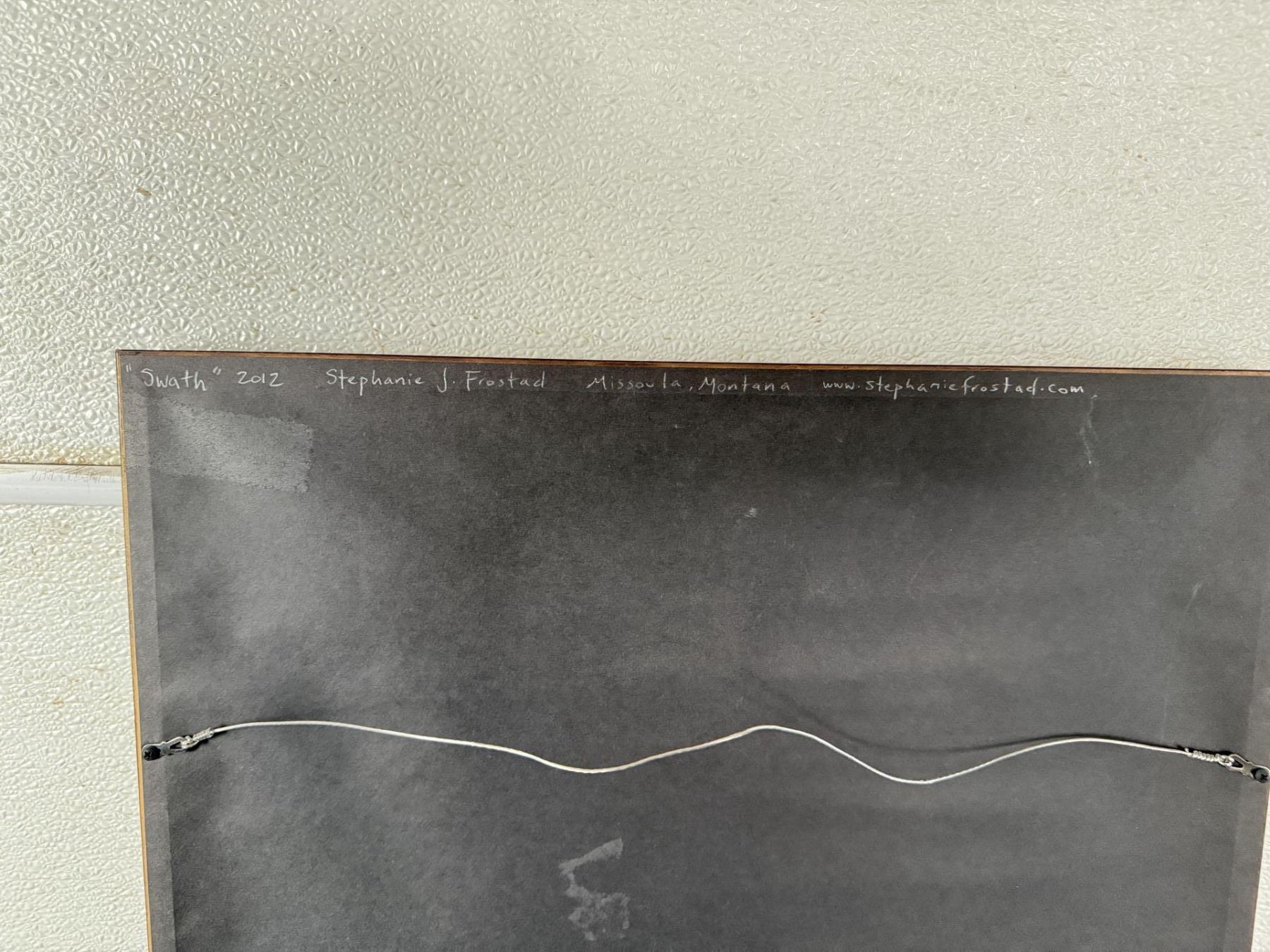 Title is Swath. 17" by 21" framed. Oil on Canvas. Stephanie J. Frostad (Born 1965) is active/lives in Montana, Washington. Stephanie Frostad is known for Figure in landscape painting, regional scene. Stephanie J. Frostad is a studio artist living in Missoula. She received a BFA from the Maryland Institute, College of Art, 1990 and completed an MFA in Painting at UM, in 1974. Frostad has exhibited throughout the United States and abroad. In 1994, she was awarded a Montana Arts Council Individual Artist Fellowship. Her work is held in numerous private and public collections including The University of Victoria in British Columbia, The Butte-Silverbow Arts Foundation, Missoula Art Museum and The University of Washington Medical Center.