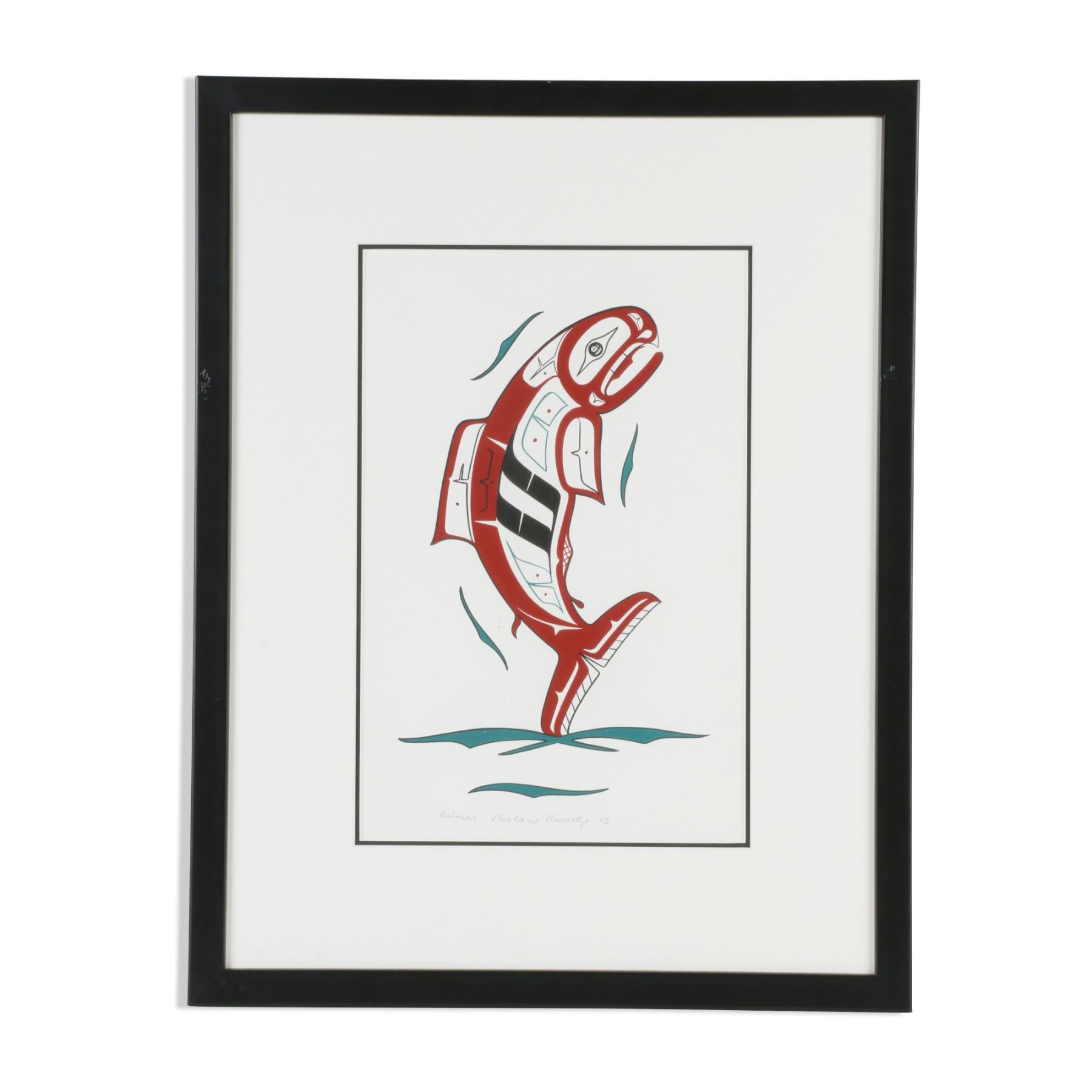 Canadian. Vancouver. 2003. Signed in pencil, "Salmon, Stephanie Kewistep 03" lower left. Original from Haida First Nation in British Columbia. 16" x " x 20.25". Minor scuffs to frame. 100-200.