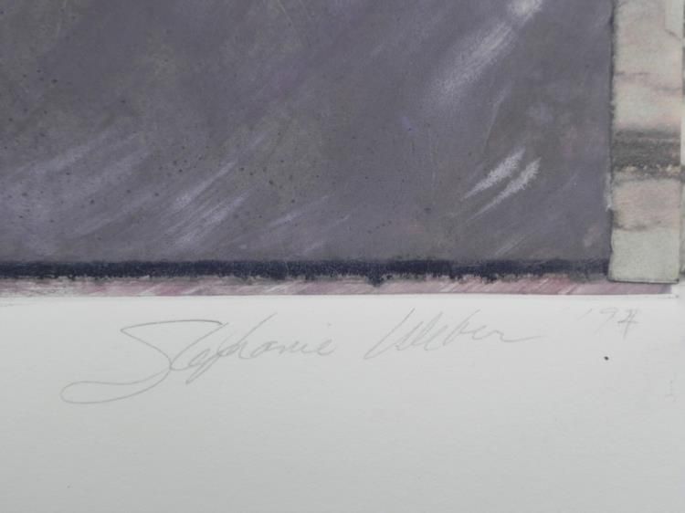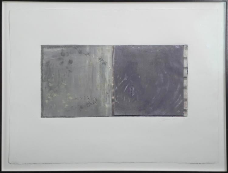This abstradt displays two panels, thick with layers that reveal spots of light and the passage of time. * * * Artist: Stephanie WeberSignature: In pencil, lower rightMedium: Mixed Media on paperImage size: 10 1/4 x 21inchesFraming: Floated on a white background, inside a dark brown wood frameFrame size: 25 x 33 inchesCondition: Excellent * * * *