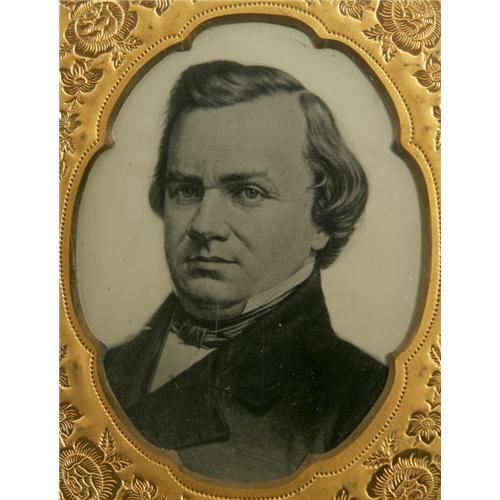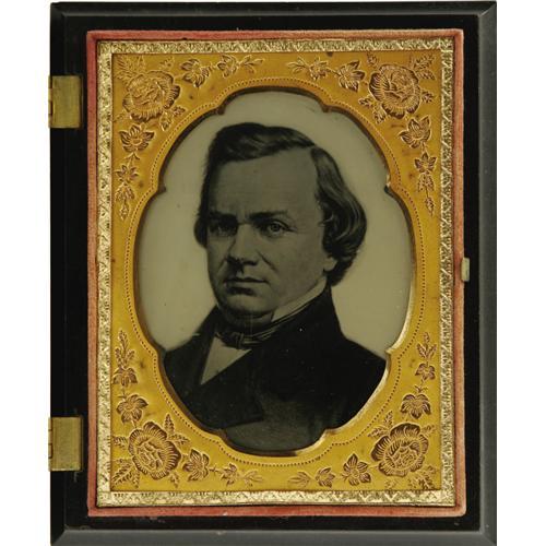 <B>Stephen A. Douglas: Massive Ambrotype Portrait in Spectacular Condition.</B></I> In the baseball card hobby, this would be termed a "blazer". Both the ambrotype and its thermoplastic case are in virtually mint condition. For strictest accuracy, we note a minor discoloration at the very bottom visible part of Douglas's coat which detracts little, if at all, from its eye-catching appeal. Douglas's image is from a well-known 1860 campaign engraving. One must really see this piece "in person" to fully appreciate the powerful statement it makes. The image itself measures 2.5" x 3.25" and overall the case measures 8.25" x 5" when displayed open. <I>From the Stanley King collection.</B></I><BR><BR><b>Shipping:</b> Small Flat (<a target="_blank" href="http://www.heritageauctions.com/common/shipping.php">view shipping information</a>)