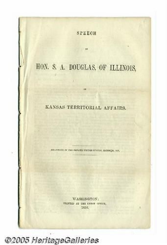 <B>Stephen A. Douglas Debates the Fate of Kansas and Slavery</B></I> 1856 speech, "KANSAS TERRITORIAL AFFAIRS," by Hon. S. A. Douglas of Illinois, printed at the Union Office, Washington, D.C. Choice extremely fine. Twenty-nine page pamphlet by the Honorable Stephen Arnold Douglas. Lightly toned, in otherwise excellent condition, 9.25" x 5.75". This is one of many speeches made by a prominent U.S. senator debating the fate of the newly added state of Kansas. Delivered on March 20, 1856. Stephen Douglas was the creator of the Kansas-Nebraska Bill, which allowed each new territory to decide whether it would be a slave state or free state. He became very famous for his debates with Abraham Lincoln on the issue of slavery. A slight crimp in the paper running in the packet from back to front is the only variation from its original form. Lot:251