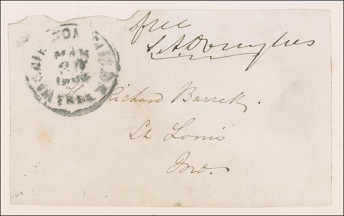 Eminent American senator and statesman (1813–1861), dubbed the ‘Little Giant,’ perhaps best remembered for his role in the Lincoln-Douglas debates during the 1858 campaign for the Senate race in Illinois. Free-franked envelope panel, 4.5 x 2.75, addressed in another hand to “Richard Barrik, St. Louis, Mo.,” and franked along the top, “Free, S. A. Douglas.” Panel also bears a Washington, D. C. Postmark. Panel is affixed to an off-white 5 x 3 card. In fine condition, with paper loss to top edge, and some scattered toning and soiling.