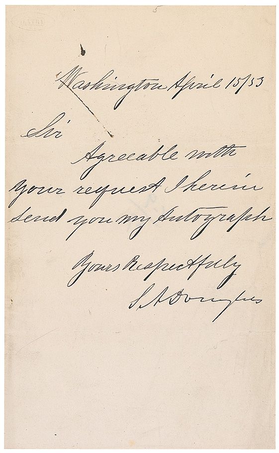 Eminent American senator and statesman (1813–1861), dubbed the ‘Little Giant,’ perhaps best remembered for his role in the Lincoln-Douglas debates during the 1858 campaign for the Senate race in Illinois. ALS signed “S. A. Douglas,” one page, 4 x 6.5, April 15, 1853. Brief letter to a collector. In full: “Agreeable with your request I herein send you my autograph.” Letter has been inlaid to a 5.5 x 8.75 off-white sheet. In fine condition, with scattered light toning and wrinkling.