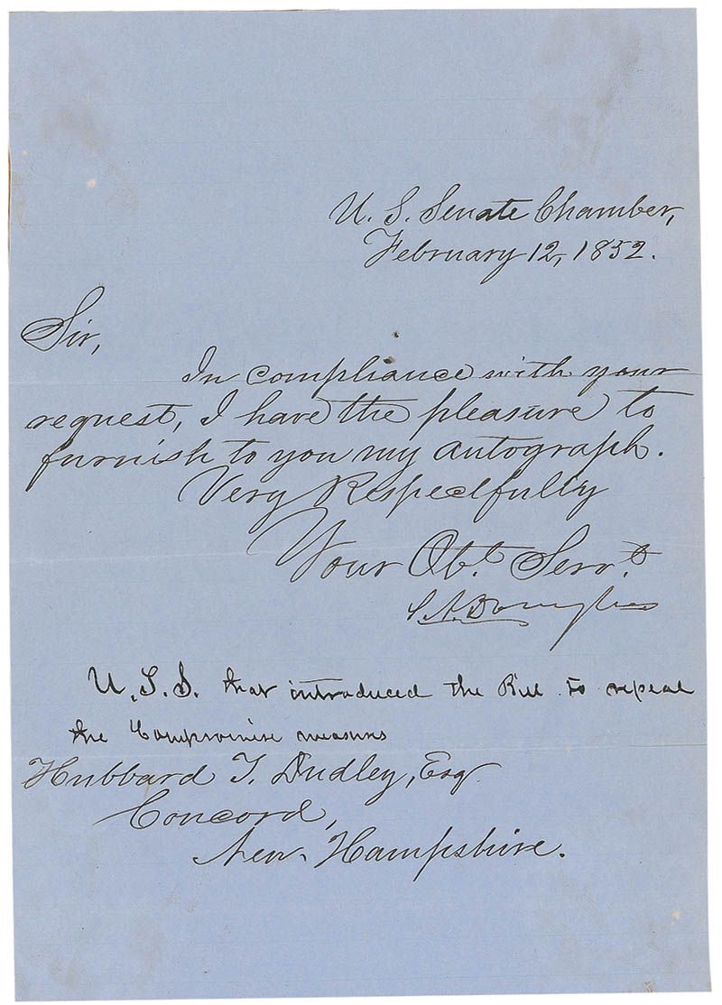 Eminent American senator and statesman (1813–1861), dubbed the ‘Little Giant,’ perhaps best remembered for his role in the Lincoln-Douglas debates during the 1858 campaign for the Senate race in Illinois. LS signed “S. A. Douglas,” one page, lightly-lined, 6.5 x 9.5, February 12, 1852. Brief letter complying with an autograph request: “In compliance with your request, I have the plasure to furnish to you my autograph.” Letter is affixed to an identical size sheet. In very good condition, with scattered rippling and wrinkling, spots of toning from adhesive, and ink notations near bottom.