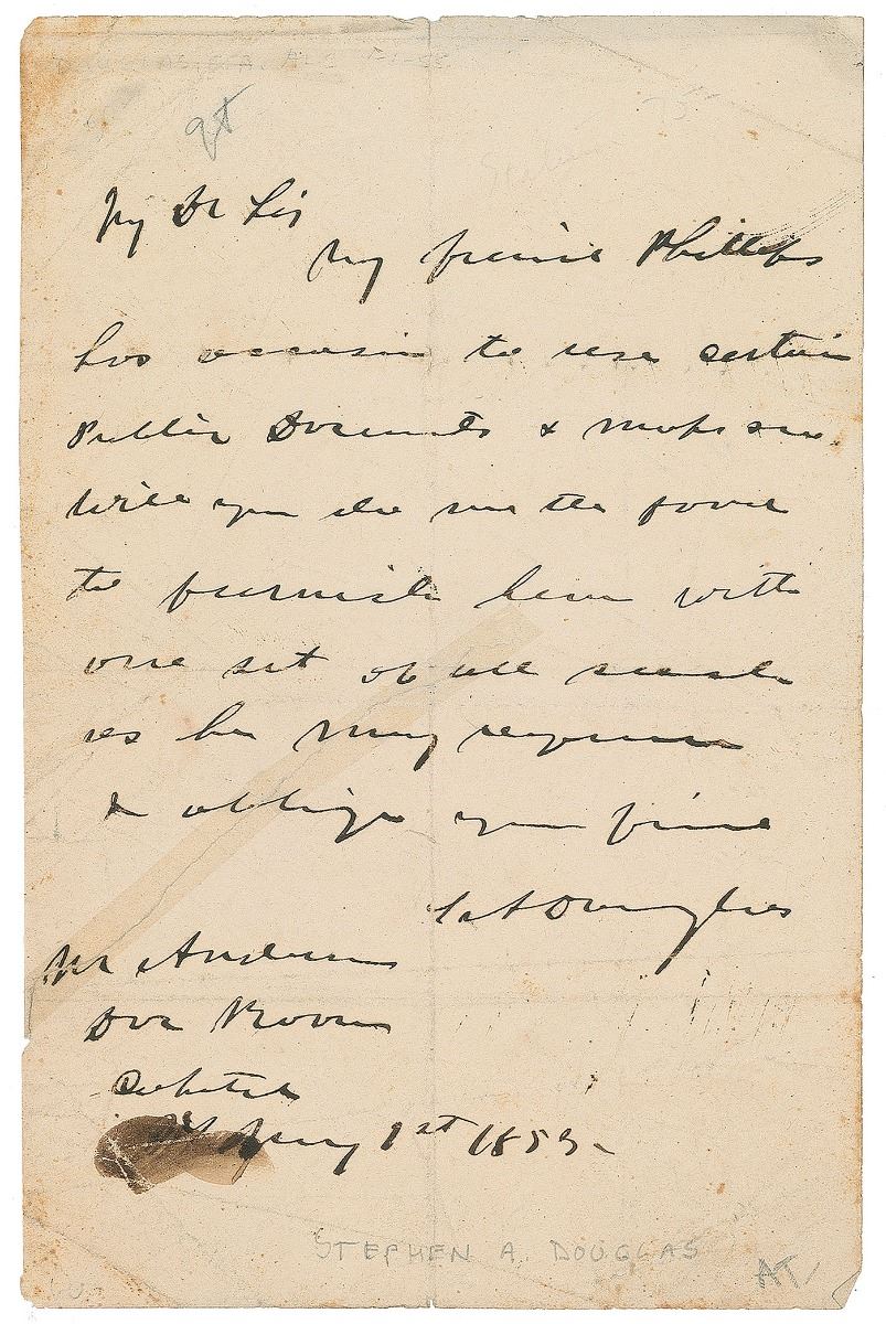 Eminent American senator and statesman (1813–1861), dubbed the ‘Little Giant,’ perhaps best remembered for his role in the Lincoln-Douglas debates during the 1858 campaign for the Senate race in Illinois. ALS signed “S. A. Douglas,” one page, 4.75 x 7.25, June 1, 1853. Letter to Mr. Anderson, in full: “My friend Phillips has occasion to use certain public documents & maps, sir will you do me the favor to furnish him with one set of all such as he requires, & oblige your time.” In very good condition, with a diagonal tear repaired with tape on the reverse.