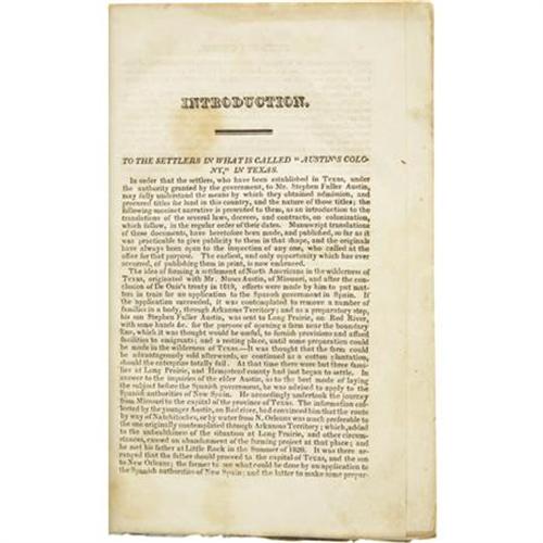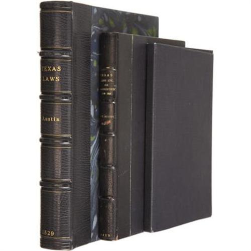 <B>Stephen Austin: </B></I><B><I>Translations of the Laws, Orders, and Contracts, on Colonization</B></I></B></I><B>,</B></I> <B><I>from January, 1821, up to this time, in virtue of which Col. Stephen F. Austin, has introduced and settled foreign emigrants in Texas,</B></I></B></I><I> </B></I><B><I>with an </B></I></B></I><B>explanatory </B></I><B><I>introduction. </B></I></B></I>(San Filipe [sic] de Austin, Texas: Printed by Godwin P. Cotton, November, 1829). First edition of the first book printed in Texas. Octavo (7.5" x 5"). 70, [1, errata] pages. Early gray wrappers. Complete with errata leaf. Some browning, staining and chipping, minor repair to title page. Very good. Housed in cloth chemise and quarter morocco book-back slipcase with five raised bands and lettered in gilt, which in turn is housed in a second custom quarter morocco clamshell case with four raised bands and gilt lettering on the spine.<BR><BR>The long introduction by Austin is Addressed "To the Settlers in what is called 'Austin's Colony,' in Texas." This is "Austin's contemporary account of the establishment of the first Anglo-American settlement of Texas. The account is buttressed by English translations of the documents and laws relating to the founding of the colony and included the Civil Regulations and Criminal Regulations by which the settlements were governed until February, 1828. It is one of the fundamental Texas books." -Streeter <I>Texas</B></I> 12. <BR><BR>In 1821, Stephen Austin's father Moses secured from the Spanish Crown a grant to bring 300 families to settle Texas. Moses died soon after returning to Missouri, and Stephen went to San Antonio that summer and was granted permission to continue the venture. Over the next few years Austin administered this and several additional land grants, thereby establishing Anglo-Texas.<BR><BR>Austin was by far the most important individual in the early history of Enlish-speaking settlement of Texas. In addition to founding the settlement, he governed it, wrote its civil and criminal code, mediated between settlers and the Mexican government, secured new lands, and brought in more than 1500 families. In his October 19, 1829 letter to Jose Antonio Navarro, Austin discussed this book: "The work is very essential and there is nothing more necessary and important for the welfare of Texas, for the reason that more of the inhabitants do not understand a word of Spanish and it is entirely impossible to govern a people with laws, whose existence the masses ignore absolutely."<BR><BR>In the coming years Austin ably represented the people of Texas, who became increasingly dissatisfied with relations with Mexico, until he was imprisoned for a year for inciting revolution. Released in July 1835, Austin was selected to be one of three commissioners to go to the United States to obtain money, arms, and men for the revolution. When he returned in June 1836, Sam Houston and others were being hailed as the heroes of the revolution. Austin lost the new republic's presidential election to Houston, who named him secretary of state. Austin, who died in December 1836 of exposure and overwork, is today known as the Father of Texas.<BR><BR>VERY RARE. Only 300 copies were printed. Long a famous Texas rarity, Austin's Translations of the Laws has for decades been considered nearly unobtainable. Even in the earliest days of the Republic of Texas, this was a scarce and sought-after book. An advertisement in the Telegraph and Texas Register in November and December 1836 stated: "Wanted. One or two copies of the pamphlet published by Colonel S.F. Austin in 1829, containing translations of the colonization laws, and of Austin's contracts with the government as empresario. Five dollars for each will be given for them on delivery at this office." <BR><BR>Fewer than a dozen survive in institutions, the number in private hands is even smaller.<BR><BR><b>Shipping:</b> Books & Catalogs (<a target="_blank" href="http://www.heritageauctions.com/common/shipping.php">view shipping information</a>)