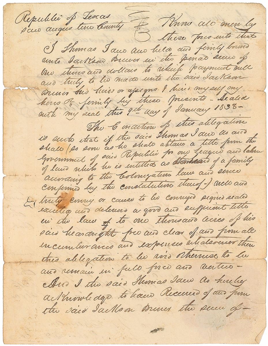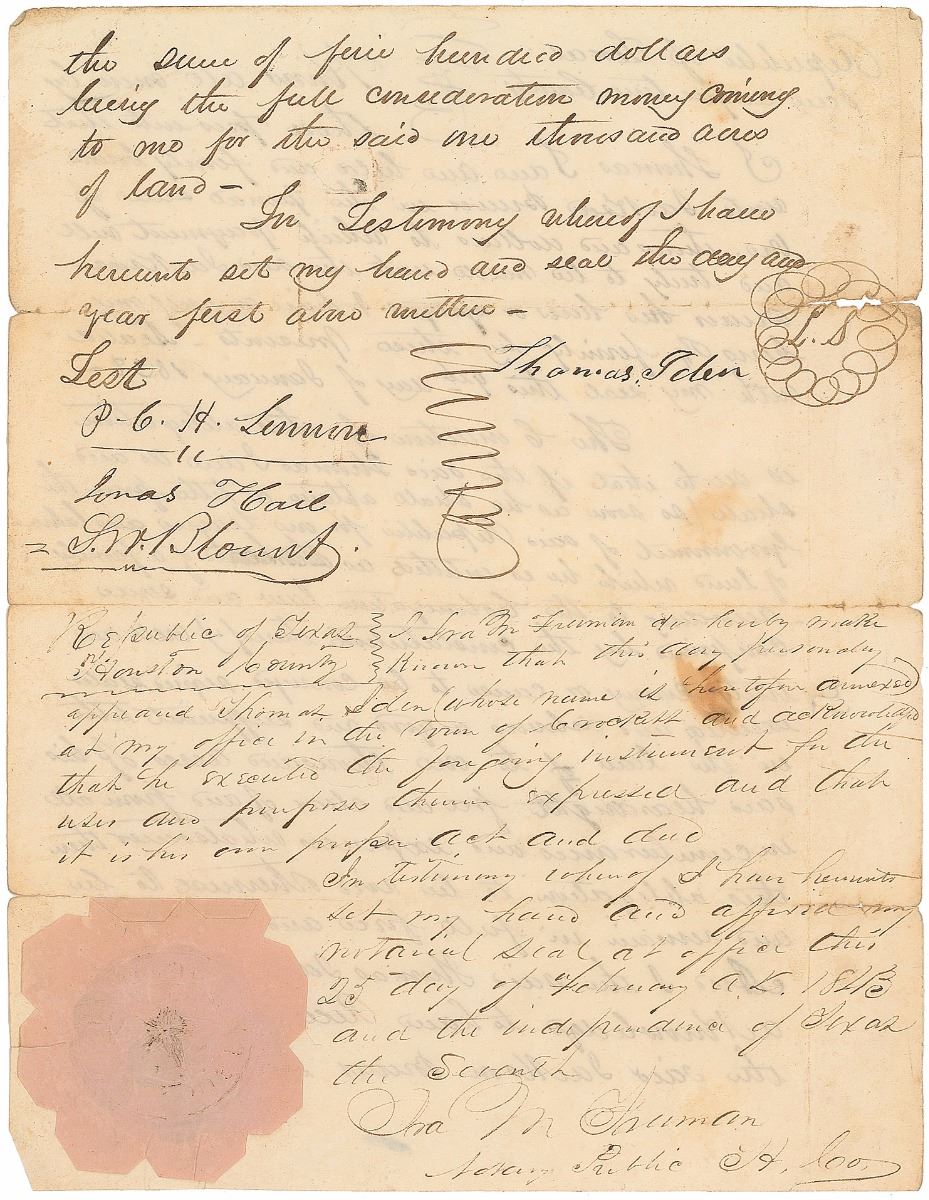 Soldier, county official, and signer of the Texas Declaration of Independence (1808–1890). Manuscript DS, signed “S. W. Blount,” one page both sides, 7.75 x 10, January 9, 1838. Republic of Texas land bond, in which “said Thomas Iden do honestly acknowledge to have Received of and from the said Jackson Brewer the sum of five hundred dollars...for the said one thousand acres of land.” Signed at the conclusion by Blount and three others. Retains the seal affixed to lower left. In very good condition, with partial edge separations to folds and scattered staining. Provenance: The Robert Davis Collection.