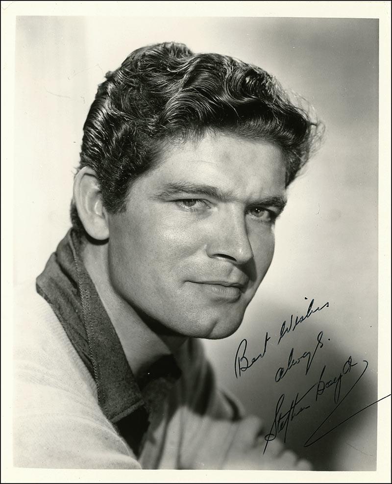 Youthful, vintage glossy 7.75 x 10 photo, signed in black fountain pen, “Best wishes always, Stephen Boyd.” In fine condition, with creasing to the top corners and lightly trimmed side edges. Pre-certified PSA/DNA and RRAuction COA.