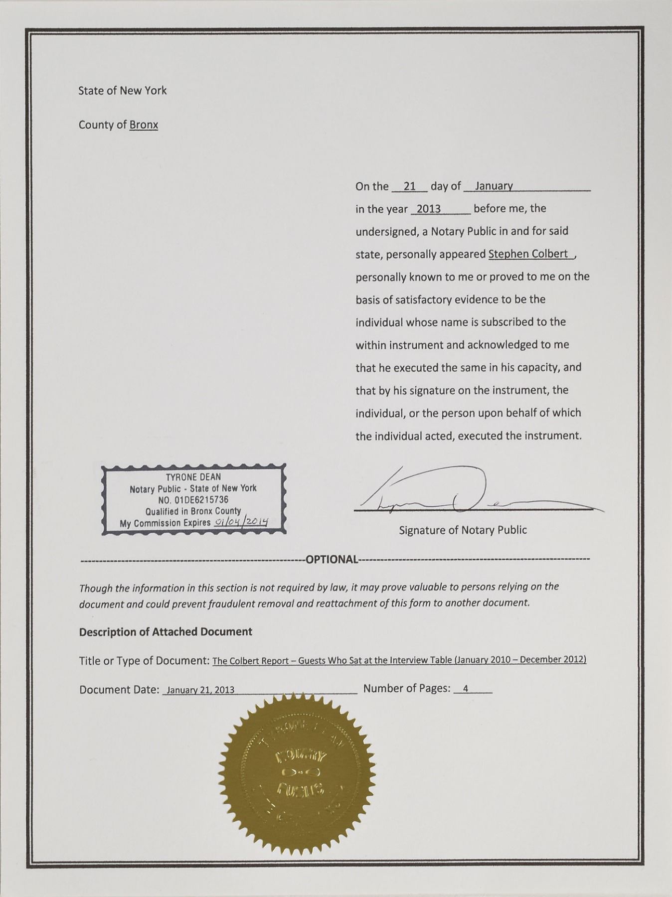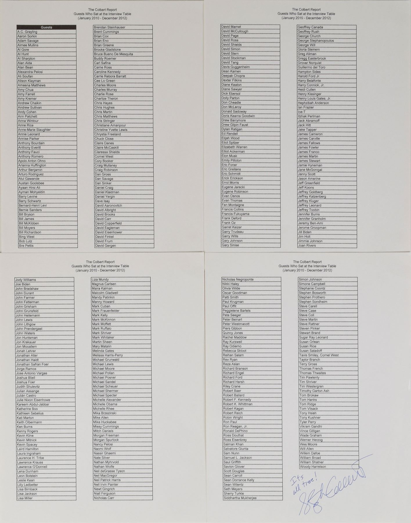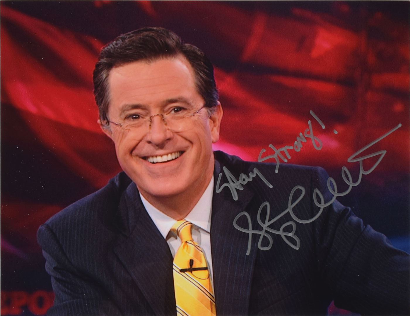 Screen-used circular interview table from Comedy Central’s late-night talk show and satirical news series The Colbert Report, used by host Stephen Colbert to interview hundreds of guests between January 2010 and December 2012 (seasons 6–8). The dark brown extendable Crate & Barrel table with curved pedestal base stands approximately 30? tall and 48? in diameter, with the tabletop bearing numerous marks and scratches made by Colbert himself. Included with the table is a four-page list of the over 400 guests that sat opposite Colbert during the show, which is signed on the final page in blue ink, “It’s all true! Stephen Colbert.” Also included is a notarized letter for the aforementioned guest list, as well as a color glossy 10 x 8 photo of Colbert, signed in silver ink, “Stay strong! Stephen Colbert.” In fine condition, with expected wear from use.