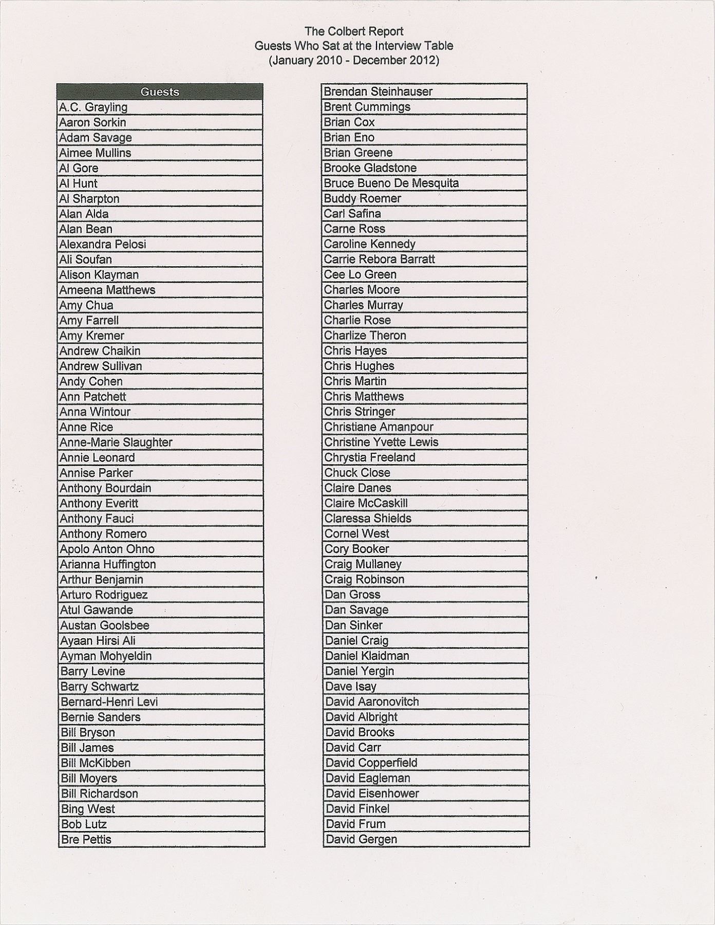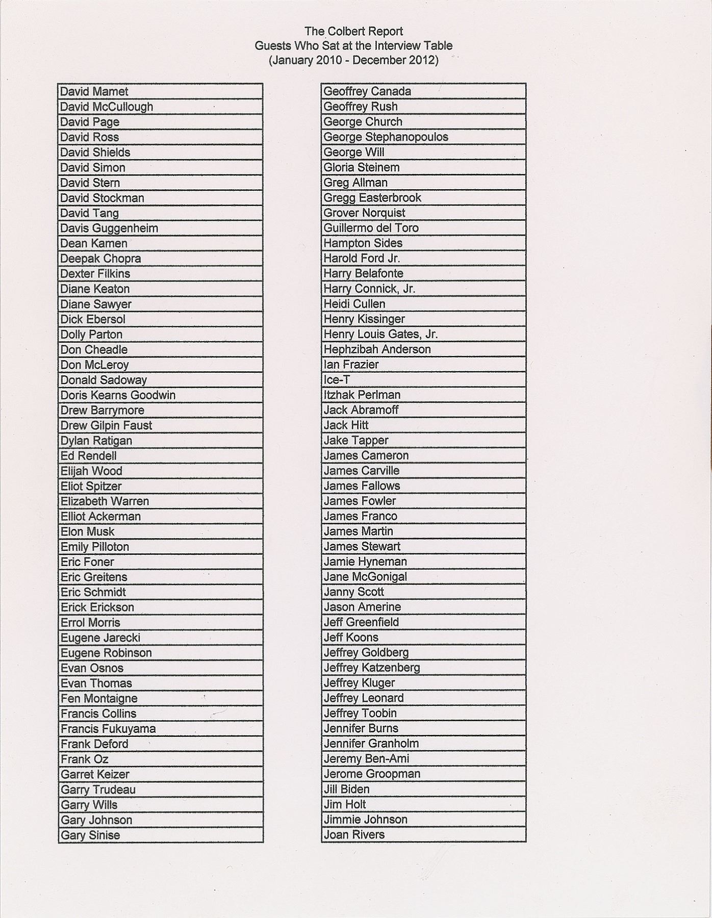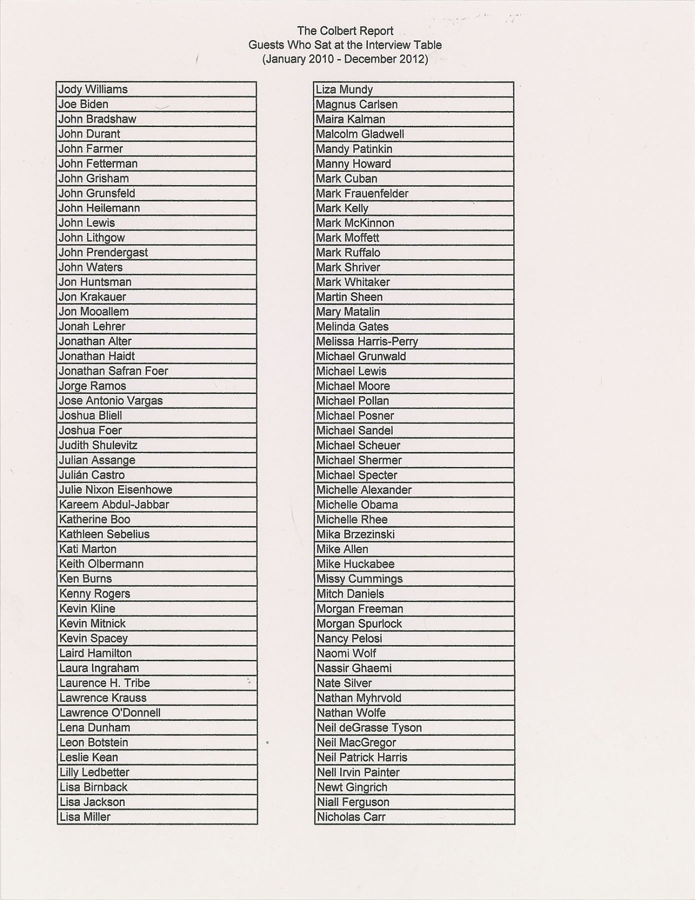 The Colbert Report premiered on Comedy Central on October 17, 2005, and enjoyed a 10-season run that included numerous awards and a broad and diverse array of celebrity guests. During the three seasons this table was used, notable interviewees included: Michelle Obama, Joe Biden, Al Gore, Bernie Sanders, Charlie Rose, Neil deGrasse Tyson, Elon Musk, James Cameron, Itzhak Perlman, Joan Rivers, Ken Burns, Bill Bryson, Caroline Kennedy, Laird Hamilton, Charlize Theron, Daniel Craig, Dolly Parton, Mark Cuban, Nancy Pelosi, Rachel Maddow, Richard Branson, Samuel L. Jackson, Steve Carell, Steve Martin, Tom Hanks, Werner Herzog, William Shatner, Claire Danes, David Copperfield, Dean Kamen, Diane Keaton, Geoffrey Rush, Henry Kissinger, Jon Krakauer, Kevin Spacey, Martin Sheen, Morgan Freeman, Newt Gingrich, Patti Smith, Quincy Jones, Sugar Ray Leonard, Vince Gilligan, and many more. On September 8, 2015, roughly nine months after taping his final episode, Colbert made his highly anticipated CBS premiere as David Letterman's Late Show successor. Backed by provenance from its hilarious longtime host, this interview table palpably represents the show’s influential union of comedy and politics—a phenomenal piece of television history.