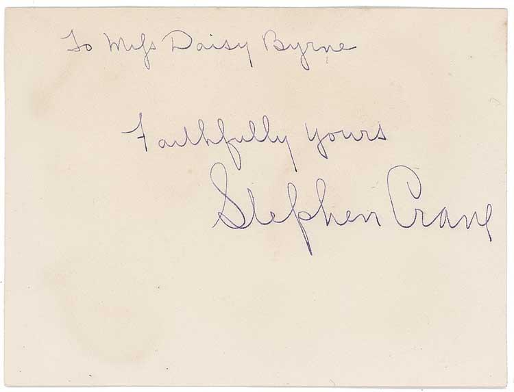 American author and journalist (1871–1900) best known for his novels Maggie: A Girl of the Streets and The Red Badge of Courage. Crane served as a war correspondent in Cuba and Greece, an experience he drew on when crafting his famous short story “The Open Boat.” After taking up residence in Europe, Crane died of tuberculosis in Germany at the age of 28. Extremely rare ink signature and inscription, “To Miss Daisy Byrne, Faithfully yours, Stephen Crane,” on an off-white 3.5 x 2.75 card. In fine condition, with some mild toning and rippling due to mounting remnants on reverse. Pre-certified John Reznikoff/PSA/DNA and RRAuction COA.