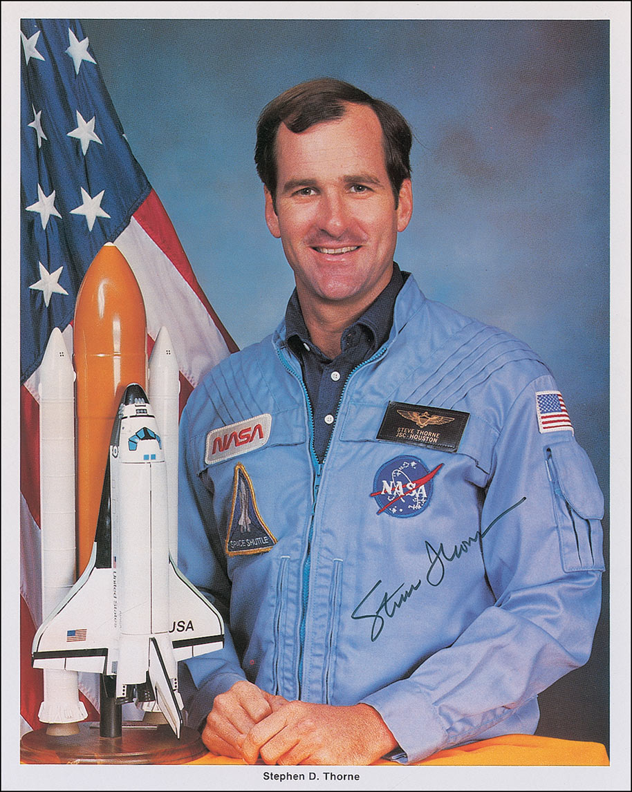 Color 8 x 10 NASA photo of Thorne in his blue flight suit next to a space shuttle model, signed in black felt tip “Steve Thorne.” In fine condition, with light paperclip impression at the top of the photo and a couple other surface impressions. Thorne is rated the toughest astronaut signature to acquire as he was killed shortly after being selected as an astronaut.