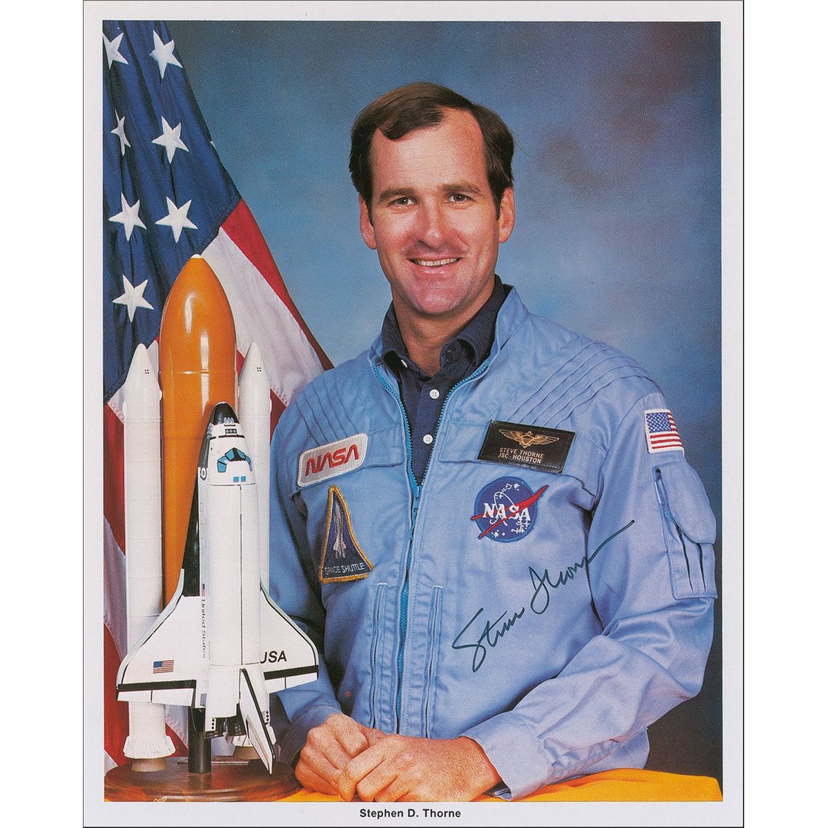 Color 8 x 10 NASA photo of Thorne in his blue flight suit next to a space shuttle model, signed in black felt tip “Steve Thorne.” In fine condition, with light paperclip impression at the top of the photo and a couple other surface impressions. Thorne is rated the toughest astronaut signature to acquire as he was killed shortly after being selected as an astronaut.