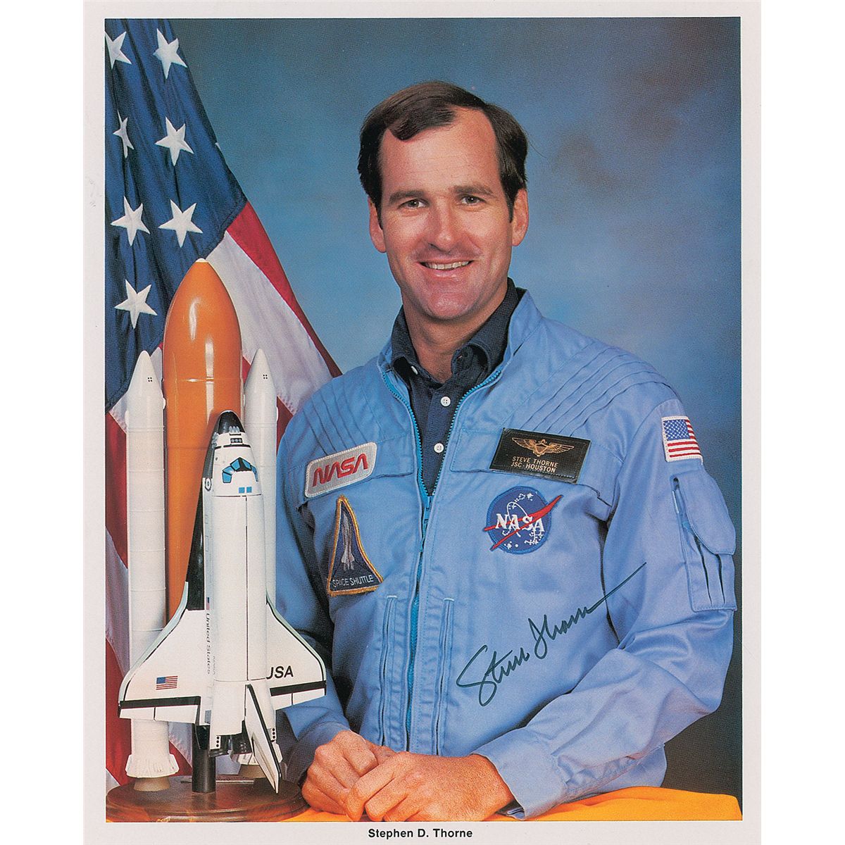 Color 8 x 10 NASA photo of Thorne in his blue flight suit next to a space shuttle model, signed in black felt tip, “Steve Thorne.” In fine condition, with a few trivial creases. Thorne is rated the toughest astronaut signature to acquire as he was killed shortly after being selected as an astronaut.