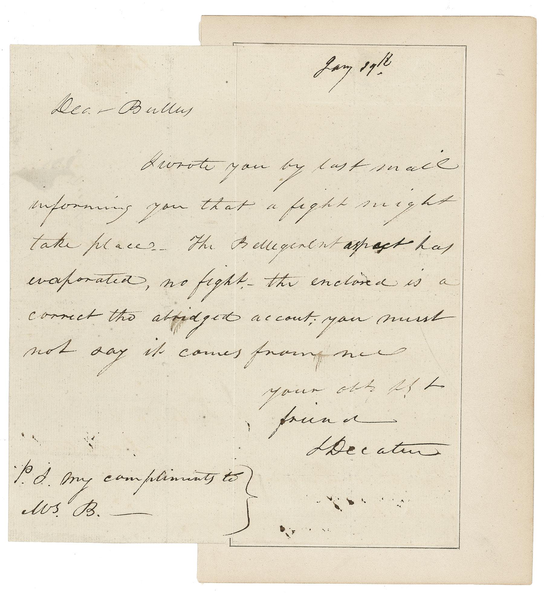 American naval officer (1779–1820) who cemented a reputation as a hero for his peerless leadership during the Barbary Wars and the War of 1812. Following a raid on a U.S. frigate that had been seized during the First Barbary War, which England’s Lord Nelson deemed “the most bold and daring act of the age,” Decatur was promoted to the rank of captain at the age of 25, a record that remains unmatched in the history of the American Navy. ALS signed “S. Decatur,” one page neatly trimmed in size to 7.25 x 8, January 19 [no year; 1815?]. Decatur writes to “Bullus” [his friend, Naval doctor John Bullus]. In full: “I wrote you by last mail informing you that a fight might take place. The belligerent aspect has evaporated, no fight—the enclosed is a correct tho abridged account; you must not say it comes from me.” After signing, Decatur adds a postscript: “My compliments to Mrs. B.” Vertical fold (tiny chip and split at bottom edge), right half of letter affixed to a slightly larger album page and left half of letter professionally reinforced on the reverse, otherwise fine, condition. Though undated, the letter may well related to the dramatic events that proved to be Decatur’s last engagement during the War of 1812. In January 1815, as the war headed into its final weeks, Decatur was assigned a mission in the East Indies. On the 14th of that month, Decatur set sail from New York in his flagship, the President. On the following day, his squadron encountered a British blockade, and the President was accidentally run aground as Decatur tried to break through. Though he was able to cripple one of the pursuing British frigates, the President was overpowered and, as Decatur himself would later explain, “my ship crippled, and more than a four-fold force opposed to me, without a chance of escape left, I deemed it my duty to surrender.” Two dozen of the men under Decatur’s command were killed, and Decatur himself, along with several dozen others, were injured. The men were taken prisoner and held until the following month; on February 8, following the cessation of hostilities between the U.S. and England, Decatur sailed for home aboard the HMS Narcissus and convalesced for several months in New York City. A remarkable and dramatic association with the war in which American naval might fully came into its own! Pre-certified John Reznikoff/PSA/DNA and RRAuction COA.