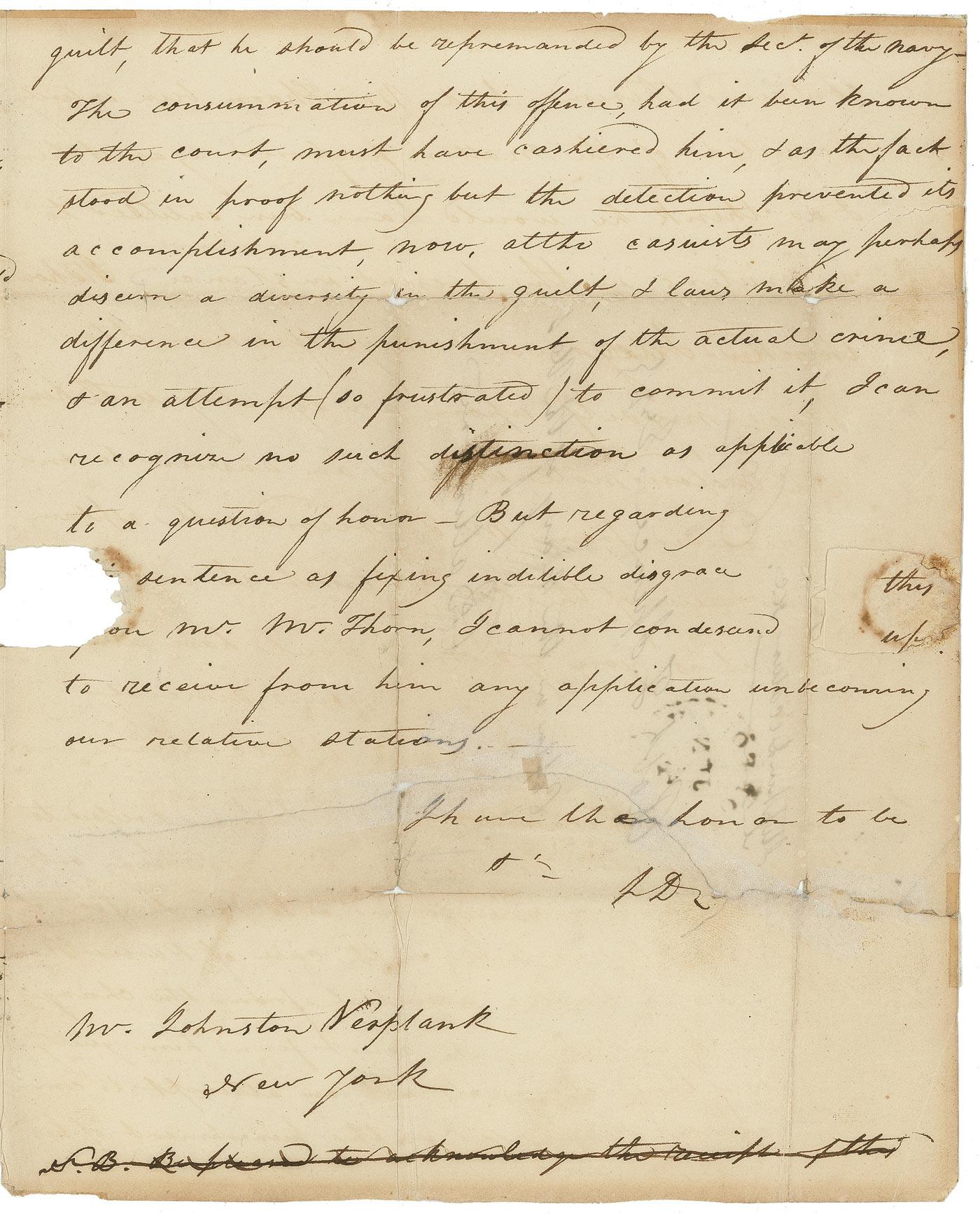 Continuing on the same page, concluding on the third page, Decatur has handwritten the text of the letter he wrote to Mr. Thorn’s friend, Mr. Johnston Verplank, in New York, and signed “SD.” In full, “Sir, your communication of the 20th Inst. addressed to me at Washington, reached me here yesterday only – you have been misinformed as to the reason of the late court martial, in the case of Purser Thorn. Instead of a ‘Public acquittal from the charges’ preferred against him, the court found him guilty of part of these charges, to wit, an attempt to commit crime & awarded as the punishment of his guilt, that he should be reprimanded by the Sect. of the Navy. The consummation of this offense, had it been known to the court, must have cashiered him, & as the facts stood in proof nothing but the detection prevented in accomplishment, now, at the casuists may perhaps discuss a diversity in this guilt, & laws make a difference in the punishment of the actual crime, & an attempt (so frustrated) to commit it, I can recognize so such distinction as applicable to a question of honor – But regarding this sentence as fixing indilible disgrace upon Mr. Thorn, I cannot condescend to receive from him any application unbecoming our relative stations.” Reverse of second page bears an address panel in Decatur’s hand, addressed to “Rot. T. Spence Esq., Captn in the Navy of the US. Baltimore.”
