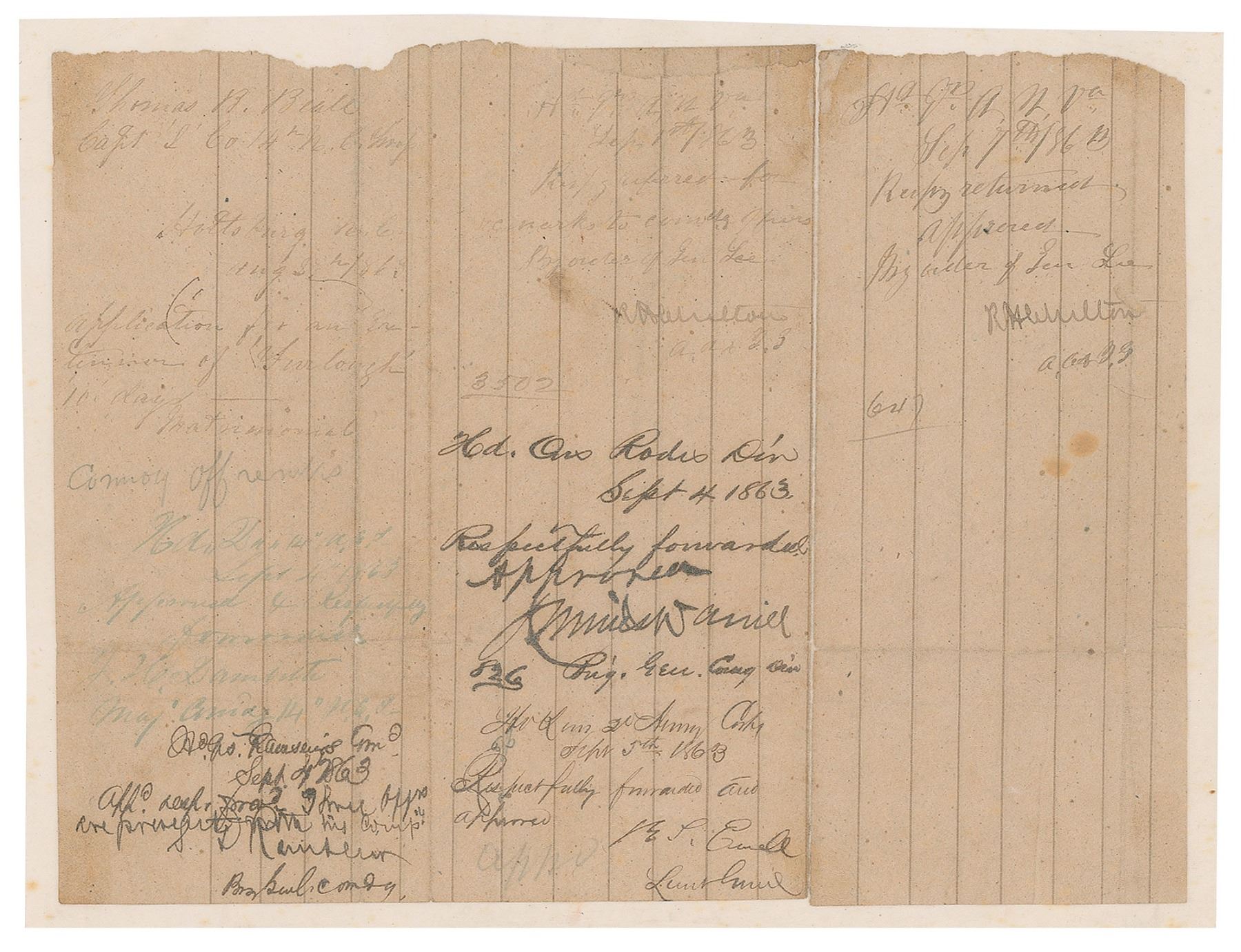 Exceedingly rare combination of Civil War-dated endorsements by Stephen Dodson Ramseur, Junius Daniel, Richard S. Ewell, and Robert H. Chilton on a docketing panel removed from an application for furlough, one page, 9.5 x 7.25, September 1863. Silked on both sides for preservation. In very good condition, with separations to folds, toning and soiling, and chipping to edges. The most notable autographs are those of Ramseur and Daniel, two Confederate heroes of the first day of Gettysburg who were both killed in action in 1864. Ramseur represents one of the rarest and most sought-after of all Civil War autographs, and Daniel is also considerably scarce. Ewell, who achieved fame as a senior commander under Stonewall Jackson and Robert E. Lee, is remembered for his controversial decisions at Gettysburg and Spotsylvania Court House. Chilton served as chief of staff under Robert E. Lee for much of the war. With an extraordinary combination of rare and important signers, this is an outstanding, likely one-of-a-kind Civil War document.