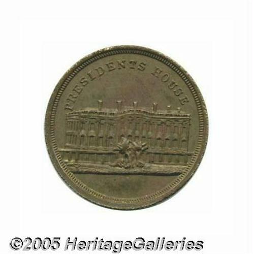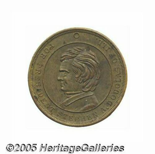 <B>Stephen Douglas Campaign Civil War Token</B></I> This Stephen Douglas campaign token from 1860 is also considered a desirable Civil War patriotic token, and is thus a piece with crossover appeal. Part of a series issued for the four presidential candidates in 1860, it depicts Stephen Douglas on the obverse and "The President's House" on the reverse. Sullivan-DeWitt SD 1860-14 in gilt brass, 22 mm. Condition is about uncirculated with a small amount of the original gilding still present. Lot:257