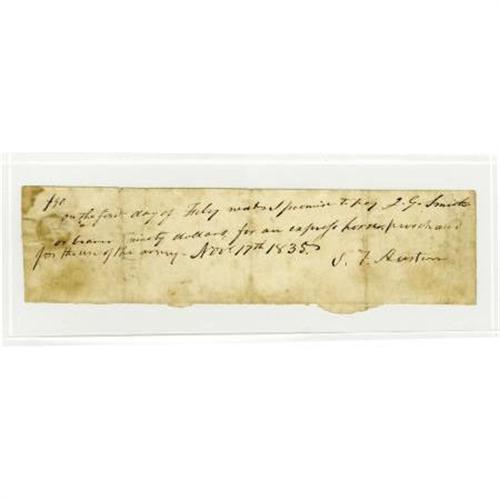 <B>Stephen F. Austin Manuscript Document Signed</B></I> "<I>S.F. Austin</B></I>," one page, 7.5" x 2". [Head Quarters Mill Station above Bexar], November 17, 1835. In full, <I>"$90/on the first day of Feby next I promise to pay J.G. Smith or bearer ninety dollars for an express horse purchased for the use of the army.</B></I>" Endorsed on verso "<I>J G Smith/Novr 18th 1835</B></I>." The siege of Bexar (San Antonio) was the first major campaign of the Texas Revolution. From October until early December 1835, an army of Texan volunteers laid siege to the Mexican army under General Martin Perfecto de Cos (Santa Ana's brother-in-law and second in command) in San Antonio de Bexar. After a Texas force drove off Mexican troops at Gonzales on October 2nd, the Texan army grew to 300 men and, on October 11th, elected Stephen F. Austin Commander-in-Chief. In November, the Consultation appointed Austin, Branch T. Archer, and William H. Wharton as commissioners to the United States to lobby for financial assistance, collect supplies, and recruit men for the Texas cause, so on November 24th, Austin resigned as Commander-in-Chief and left the Texas Army. In Austin's Order Book for the Campaign of 1835 [reprinted in the <I>Quarterly of the Texas State Historical Association</B></I>, Volume 011, Issue 1, 1908], his letters of November 16th, 17th, and 18th are written from "Head Quarters Mill Station above Bexar". Irregular lower edge. Vertical folds, one passing through the "<I>F</B></I>" in signature. Light soiling. Remnant of red wax seal on verso. Fine condition. <I>From the collection of Darrel Brown.</B></I><BR><BR><B>Reference:</B></I> Streeter 64<BR><BR><b>Shipping:</b> Flat Material, Small (<a target="_blank" href="http://www.heritageauctions.com/common/shipping.php">view shipping information</a>)<BR><BR><B>Important notice: