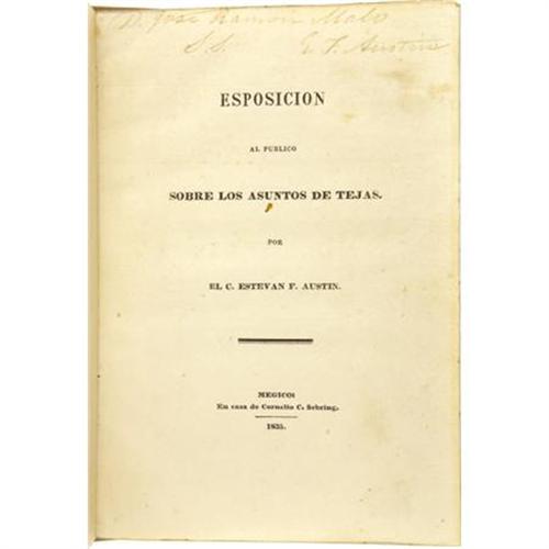 <B>[Stephen F. Austin] El C. Estevan F. Austin: </B></I><B><I>Esposicion al Publico Sobre Los Asuntos de Tejas</B></I></B></I><B>.</B></I> <I>Por El C. Estevan F. Austin. </B></I>(Megico [sic]: Eu casa de Cornelio C. Sebring, 1835). First and original edition. Author's presentation copy, inscribed at the top of the title page: "To D. Jose Ramon Malo / E.F. Austin." Small quarto (7.25" x 5.5"). 32 pages. Full nineteenth-century antique-style calf, edges stained blue. Minor soiling and rubbing, pencil notes to one margin, ink numerals to rear blank leaf, else a fine copy. Housed in a quarter brown morocco clamshell case. <I>From the collection of Darrel Brown.</B></I><BR><BR><B>Reference: </B></I>Streeter 817: "This <I>Esposicion </B></I>was written shortly after Austin's release on bail from his long confinement at Mexico City and is dated at the end of its main text, Megico, Enero 18, de 1835. It is followed on page 26, by five numbered exhibits. These include an extract from the instructions to Austin of the Texas convention which had met in April, 1833, and a copy of Austin's letter of October 2, 1833, to the ayuntamiento of Bexar, the letter which led to his arrest at Saltillo on January 3, 1834, as he was returning to Texas. The <I>Esposicion</B></I>, written in the third person, is primarily an able defense of the memorial adopted by the Convention of April 1833, and an explanation of the letter of October 2, 1833, which had caused Austin's arrest. It is one of the important Texas documents ... Dr. Barker says that 450 copies were printed." <I>Fifty Texas Rarities</B></I> 11: "Austin had gone to Mexico City somewhat reluctantly to argue for a measure of autonomy for Texas. He argued himself into jail (charged with disloyalty to the Mexican Government), where he spent his time composing this explanation of the attitude of Texas toward Mexico." The only work actually written and published by the "Father of Texas." Eberstadt, Texas 162:40. Graff 116. Howes A403. Rader 213. Raines, page 15. Not in Sabin.<BR><BR><b>Shipping:</b> Books & Catalogs (<a target="_blank" href="http://www.heritageauctions.com/common/shipping.php">view shipping information</a>)