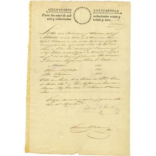 <B>Stephen F. Austin Signed</B></I> <B>Official Report Communicating Results of the First Municipal Election for </B></I><B><I>Alcalde</B></I></B></I> in San Felipe de Austin. Signed <I>"Estevan F. Austin"</B></I>, the document is written entirely in Spanish by Austin's secretary Samuel M. Williams, who also co-signs beneath Austin's signature. One page, folio, 8.5" x 12.75", Villa de Austin [San Felipe], February 10, 1828; [on official stamped paper with manuscript notation furthering the time period to <I>"y ocho"</B></I>, 1828, rubricated by Williams].<BR><BR>The document reads:<BR><I>"List of the individuals who received votes for Alcalde of this town in the municipal assembly held therein the 10th of this month in accordance with the special order of his Excellency the Governor of the State the 17th of November of the past year, and communicated by the political chief of this department December 11 of the same year by means of a commission to the Citizen Empresario Stephen F. Austin to preside over the said assembly. <BR> Names Votes <BR> Thomas M. Duke 121 <BR> Ira Ingram 111 <BR><BR>Villa de Austin, February 10, 1828. = Estevan F Austin, President = Green B. Jameson, Teller = Rawson Alley, Teller = Samuel M. Williams, Secretary<BR>This is a copy taken of the original that remains in hands of the Ayuntamento"</B></I><BR>Austin and Williams sign beneath.<BR><BR>The above election results, are included in the identical wording and format in Spanish, in the minutes of the ayuntamiento of San Felipe de Austin in the Spanish department of the General Land Office at Austin, Texas, Vol. 1, page 4. These volumes include all minutes from the ayuntamientos installation on February 12, 1828, to January 3, 1832. After this entry, the minutes read: "These elections having been announced by the presiding officer, the list was immediately posted in the most public place, and it was agreed that attested copies should be taken from this to be sent to the Government, forwarded by direction of Citizen Stephen F. Austin..." This document is one of these "attested copies" sent to the Government, making it an exceedingly rare documentation of early Texas history to remain in private hands.<BR><BR>Stephen F. Austin was appointed to hold the first municipal electoral assembly of the Jurisdiction of Austin, Department of Bexar on November 17, 1827 by the Governor of the State of Coahuila y Texas, Victor Blanco. San Felipe de Austin was the capital of this Jurisdiction. This action would create the <I>Ayuntamiento</B></I>, the principal governing body of Spanish municipalities. It functioned as town council and had a wide range of administrative duties. The council members consisted of the <I>Alcalde</B></I>, who served as president, a varying number of <I>Regidors</B></I> or councilmen, and a <I>Sindico Procurador</B></I>, the equivalent of a city attorney. Austin had served as president up to this time; however, his interests lay mainly in his role as an empresario focusing on developing the colonies and he another person would be better suited as Alcalde. The document has a quarter inch band of staining along left margin (likely from previous matting), well away from all text; also light folds, with a tiny separation thereat; otherwise in near fine condition. <I>From the collection of Darrel Brown.</B></I><BR><BR><b>Shipping:</b> Flat Material, Small (<a target="_blank" href="http://www.heritageauctions.com/common/shipping.php">view shipping information</a>)