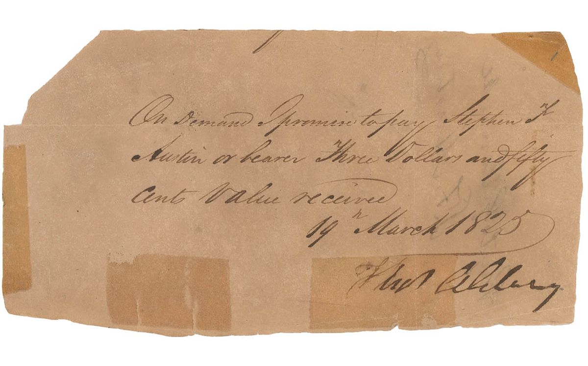 American pioneer (1793–1836), known as the ‘Father of Texas,’ who colonized the former Mexican lands that would become the Lone Star State. Between 1822 and 1830 Austin presented Texan demands for autonomy to the Mexican government. Negotiations proved difficult, and the Mexicans went so far as to imprison Austin. The settlers eventually decided not to comply, which led to wars and, ultimately, the infamous slaughter at the Alamo in 1836. Endorsement, signed “S. F. Austin,” on the reverse of a 6.25 x 3.25 manuscript promissory note, dated March 19, 1825. Note reads, “On demand I promise to pay Stephen F. Austin or bearer Three dollars and fifty cents value received,” and signed at the bottom by Thomas Alilury. Endorsed on the reverse, “Pay to G. Tennell, S. F. Austin.” In good to very good condition, with intersecting folds, one through a single letter of signature, several tape repairs to folds and edges, paper loss to one corner, and moderate overall toning.