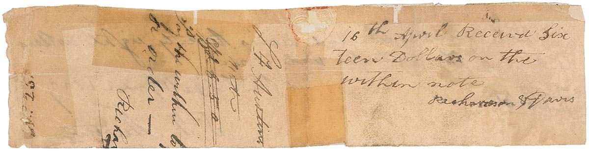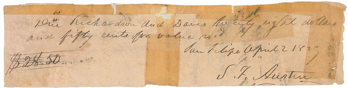 American pioneer (1793–1836), known as the ‘Father of Texas,’ who colonized the former Mexican lands that would become the Lone Star State. Between 1822 and 1830 Austin presented Texan demands for autonomy to the Mexican government. Negotiations proved difficult, and the Mexicans went so far as to imprison Austin. The settlers eventually decided not to comply, which led to wars and, ultimately, the infamous slaughter at the Alamo in 1836. Manuscript DS, signed “S. F. Austin,” one page, 7.75 x 2, April 2, 1829. Pay order reads, “Due Richardson and Davis Twenty eight dollars and fifty cents for value rec’d.” Signed at the conclusion by Austin. Old tape repairs to central vertical fold and edges, some over portions of text, paper loss along top edge, intersecting folds, and scattered creases and toning, otherwise good condition.
