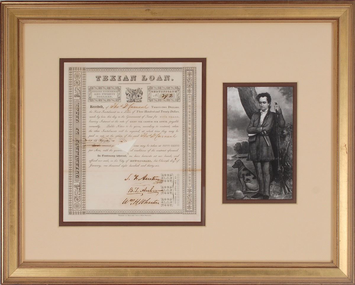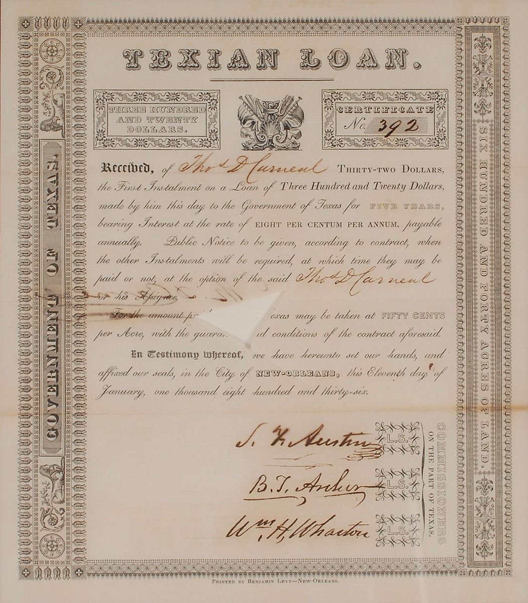 Partly-printed DS, signed “S. F. Austin,” one page, 7.75 x 8.75, January 11, 1836. Ornate financial document headed “Texian Loan,” in part: “Received of Thos. D. Carneal Thirty-two Dollars, the First Installment on a Loan of Three Hundred and Twenty Dollars, made by him this day to the Government of Texas for Five Years.” Boldly signed at the conclusion by Austin and countersigned by two other commissioners, Branch T. Archer and William H. Wharton. Attractively double-matted and framed with a portrait of Austin to an overall size of 20 x 16. Expected document wear, a triangular cancellation cut affecting the body of the document, slight feathering to ink, and show-through from docketing to reverse, otherwise fine condition.