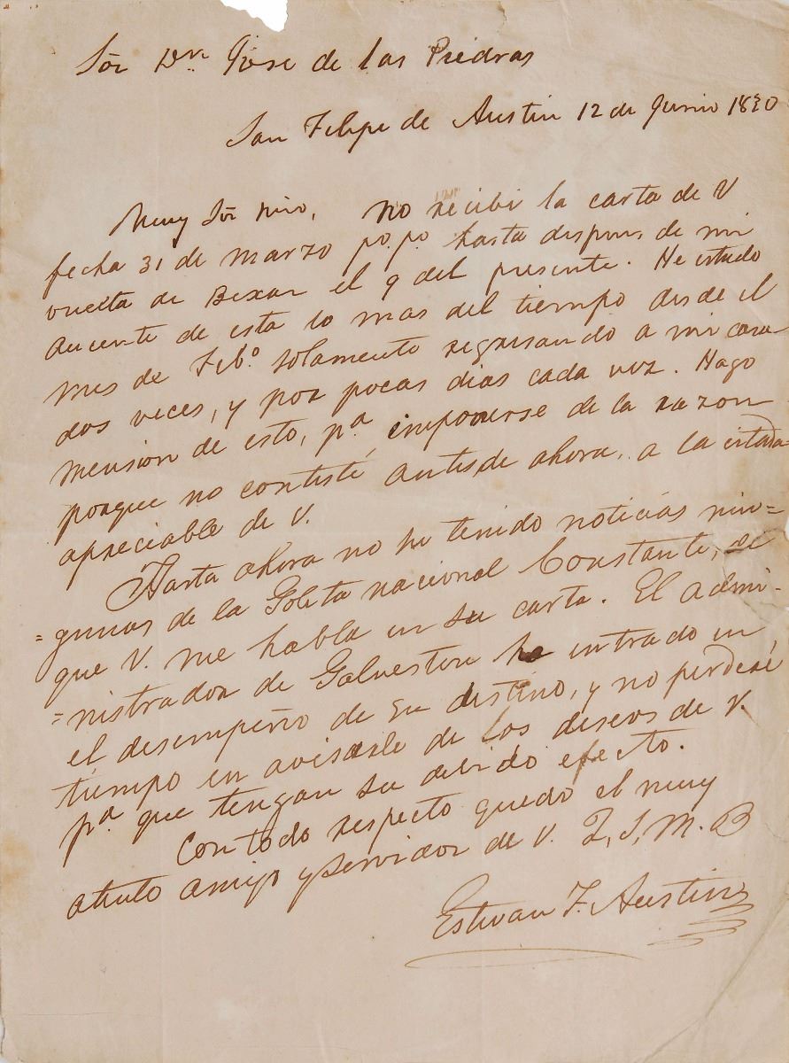 ALS in Spanish, signed “Estevan F. Austin,” one page, 7 x 9.25, June 12, 1830. Letter to Jose de las Piedras, commander of the Mexican forces in Nacogdoches, written from San Felipe de Austin. In full (translated): "My dear sir, I did not receive your letter dated on the 31st of March just past until after my return from Bexar on the 9th of this month. I have been absent from these parts most of the time since the month of February, only returning to my house twice, and for a few days each time. I mention this in order to inform you of the reason why I did not answer your mentioned and estimable letter before now. Up to now, I have not had any news of the national schooner Constante that you tell me about in your letter. The Galveston administrator has started to carry out the duties of his post, and I will waste no time in advising him of your desires, so that they may have the appropriate effect. With all respect, I remain your very attentive friend and servant, who kisses your hands.” In very good to fine condition, with light mottled toning, chip to top edge, and a tear to the right side passing through two words of text. Rare in autographic material of any form, this is the first Stephen Austin ALS we have ever offered.