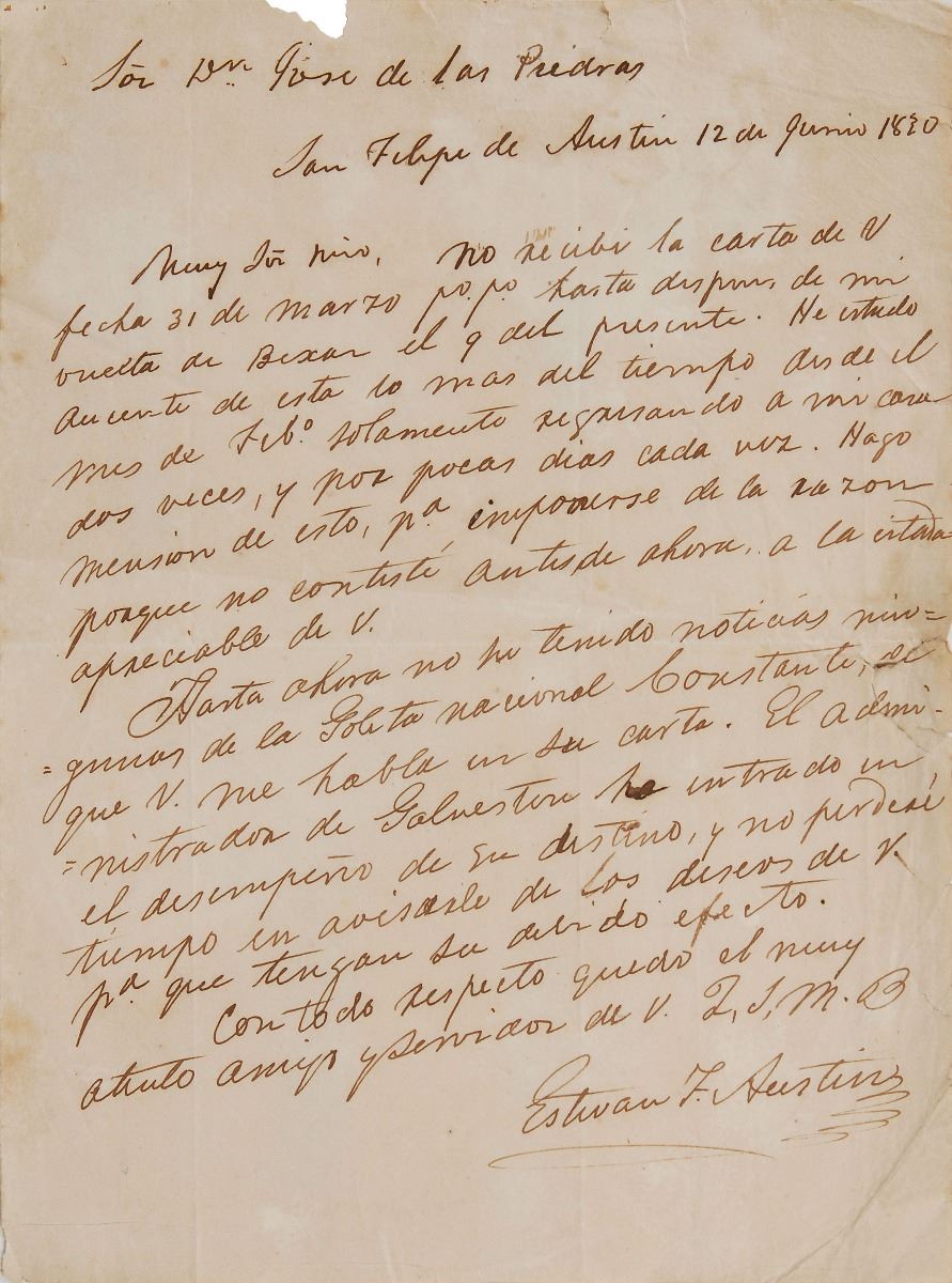 ALS in Spanish, signed "Estevan F. Austin," one page, 7 x 9.25, June 12, 1830. Letter to Jose de las Piedras, commander of the Mexican forces in Nacogdoches, written from San Felipe de Austin. In full (translated): "My dear sir, I did not receive your letter dated on the 31st of March just past until after my return from Bexar on the 9th of this month. I have been absent from these parts most of the time since the month of February, only returning to my house twice, and for a few days each time. I mention this in order to inform you of the reason why I did not answer your mentioned and estimable letter before now. Up to now, I have not had any news of the national schooner Constante that you tell me about in your letter. The Galveston administrator has started to carry out the duties of his post, and I will waste no time in advising him of your desires, so that they may have the appropriate effect. With all respect, I remain your very attentive friend and servant, who kisses your hands." In very good to fine condition, with light mottled toning, chip to top edge, and a tear to the right side passing through two words of text. Rare in autographic material of any form, this is the first Stephen Austin ALS we have ever offered.