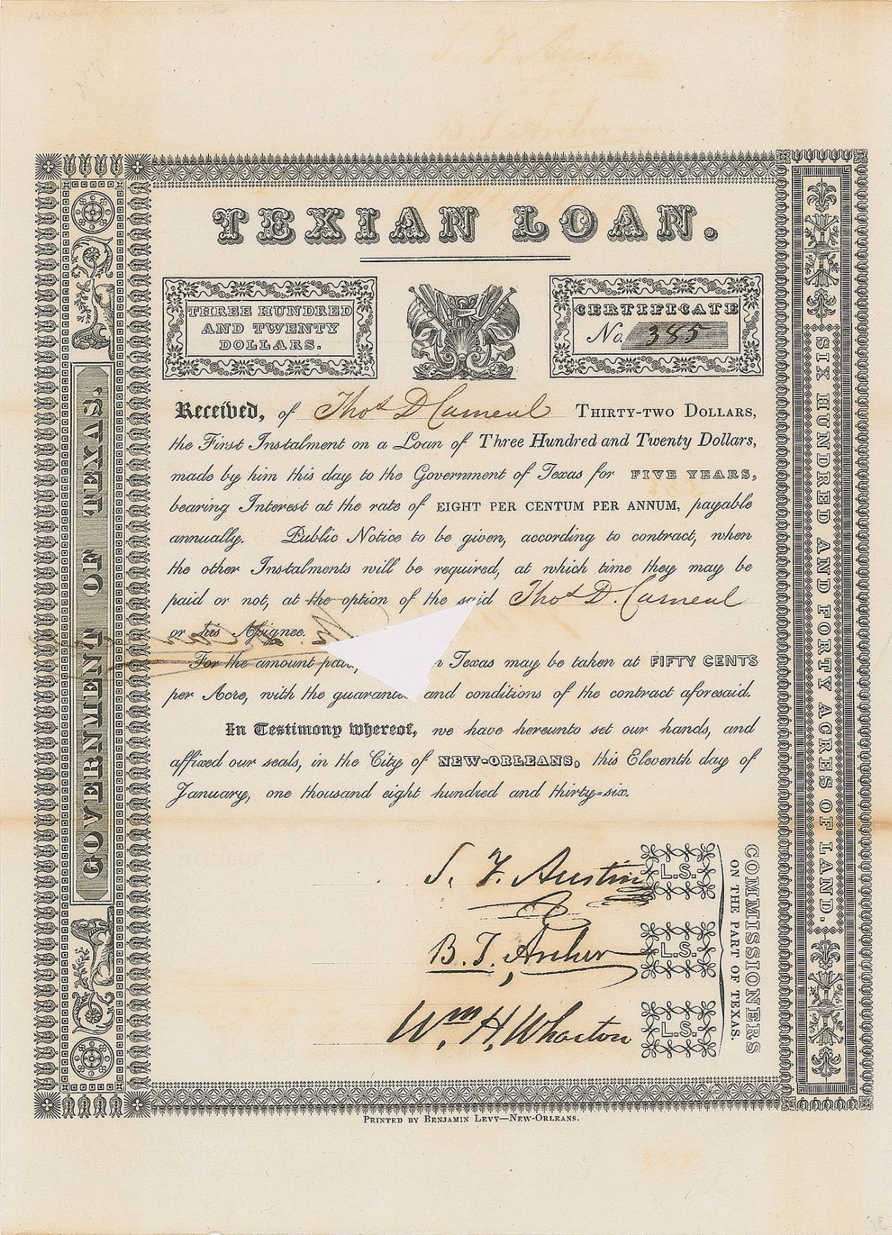 Partly-printed DS, signed “S. F. Austin,” one page, 7.75 x 10.75, January 11, 1836. Ornate financial document headed “Texian Loan,” in part: “Received of Thos. D. Carneal Thirty-two Dollars, the First Installment on a Loan of Three Hundred and Twenty Dollars, made by him this day to the Government of Texas for Five Years.” Boldly signed at the conclusion by Austin and countersigned by two other commissioners, Branch T. Archer and William H. Wharton. In fine condition, with areas of light toning, and a triangular cancellation hole at the center affecting a couple of words of text.