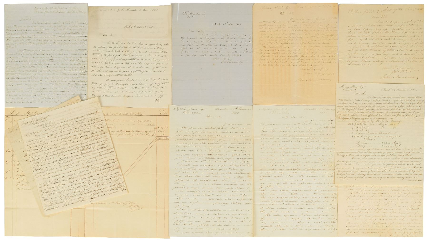 In 1850, the court ruled that the Bastrop titles were indeed invalid, and the case was sent back to the Federal District Court in Louisiana for further adjudication. In March 1851, Congress enacted legislation enabling all settlers who could prove they occupied and cultivated land in the Bastrop grant for 20 years to receive legal title. The final letter to Olmstead comes from New Orleans attorney H. H. Strawbridge, New Orleans, dated May 13, 1854, and concerns a petition to Congress under that legislation: “The memorial to Congress on the Bastrop Grant, it has been suggested that its tone seems not quite respectful to the Supreme Court. As I will to avoid err the appearance of this—were it only at respect to myself—I beg you will withhold it a few days, until another can be drafted.” In overall very good to fine condition. These letters provide unique insight into the long and convoluted history of the Bastrop tract as well as illustrating the large reach of Stephen Girard, who when he died, was the richest man in the United States.