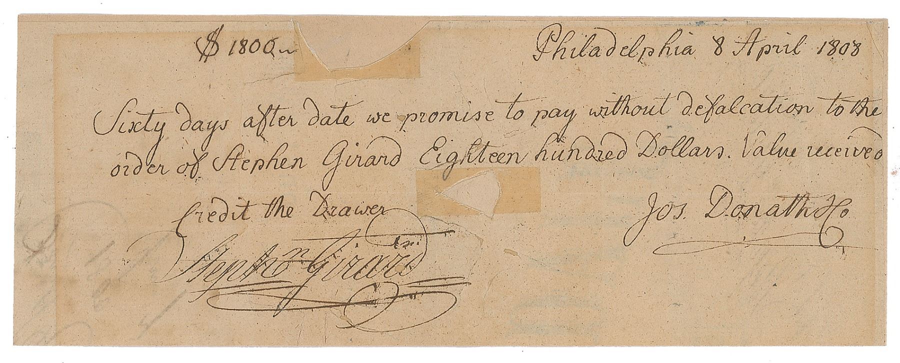 Manuscript DS, one page, 7.5 x 2.75, April 8, 1808. Promissory note issued by Joseph Donath & Co., which reads: "Sixty days after date we promise to pay without defalcation to the order of Stephen Girard Eighteen hundred Dollars." Signed in the lower left by Girard and countersigned by Donath. The document is affixed to a same-size sheet. In very good to fine condition, with light toning, two areas of old tape, and complete backing for reinforcement.