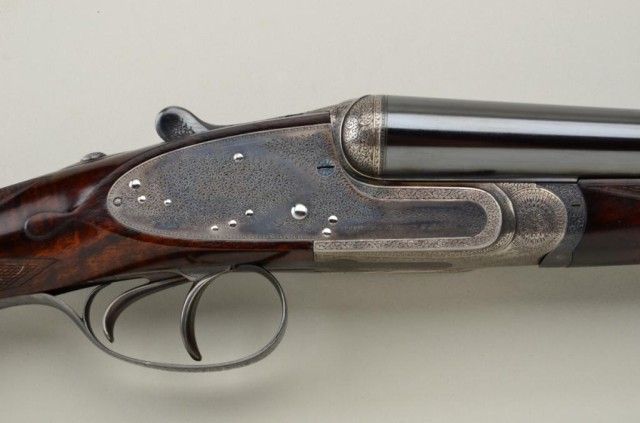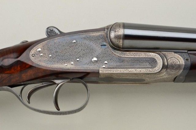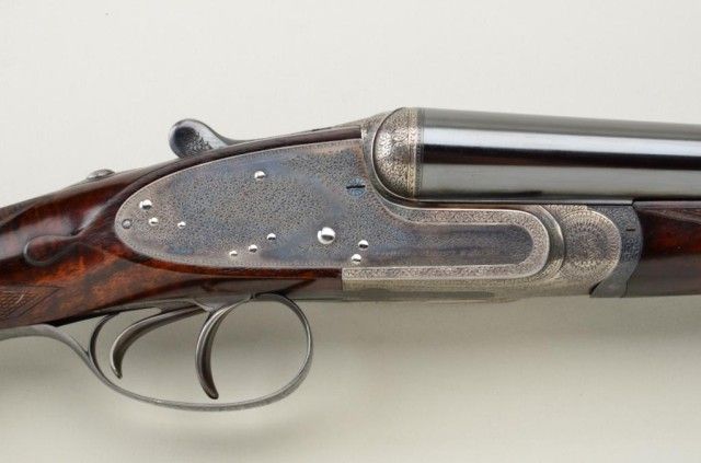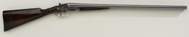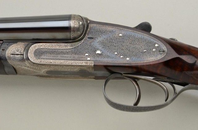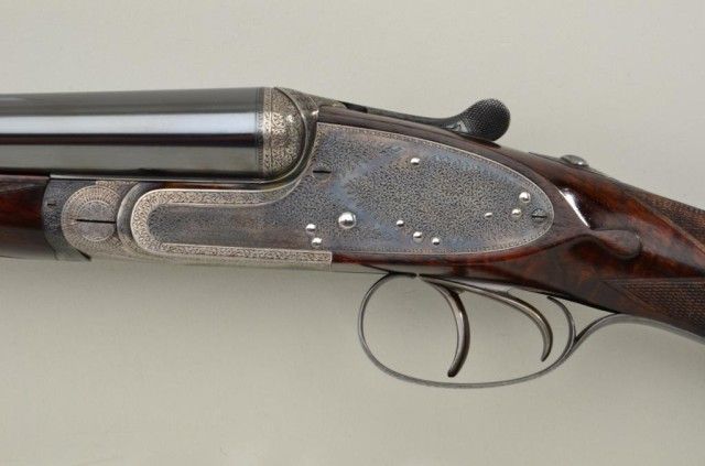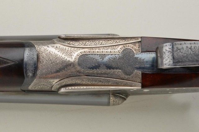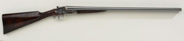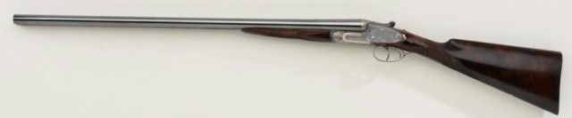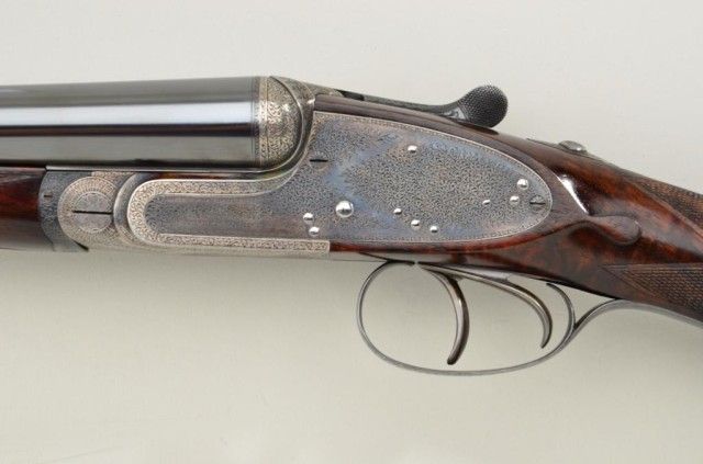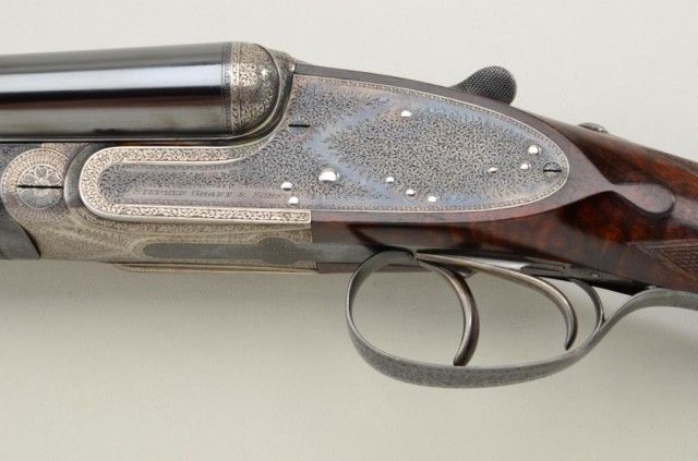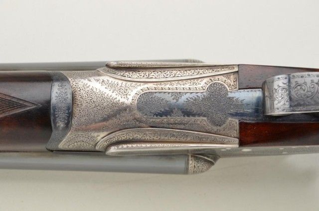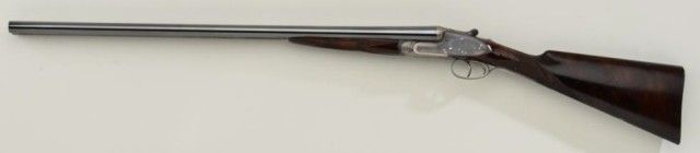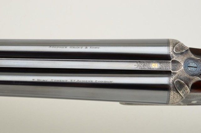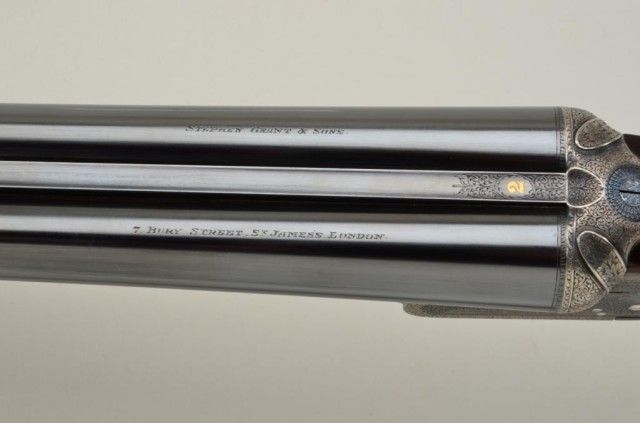 Stephen Grant & Sons self opening full side lock shotgun with double triggers, auto ejectors in 12 gauge with 28" barrels, serial #17361 in English leather motoring type case. The gun shows 2-3/4" chambers(lengthened and not in proof) and left barrel is .27 improved modified choke, right barrel .09 improved cyl. The left barrel shows a wall thickness of .20 and right barrel shows wall thickness of .19. The stock measures14-1/8" to the end of the checkered wood butt with a 2-3/4" drop at the heel and 1-3/4" drop at comb. The top of the breech is numbered with a gold "2" indicating one of a pair. The frame and side plates show finequality bank note scroll engraving with leaf borders. The barrel shows an excellent English quality refinish with 98% correct color blue remaining. The frame shows 70-80% original case hardening with some goodcolors. The trigger guard shows 90-95% blue matching to the barrel. The stocks have been professionally refreshed with excellent fit, sharp checkering. The belly of the stock shows a gold inlaid "PH" initial. The case