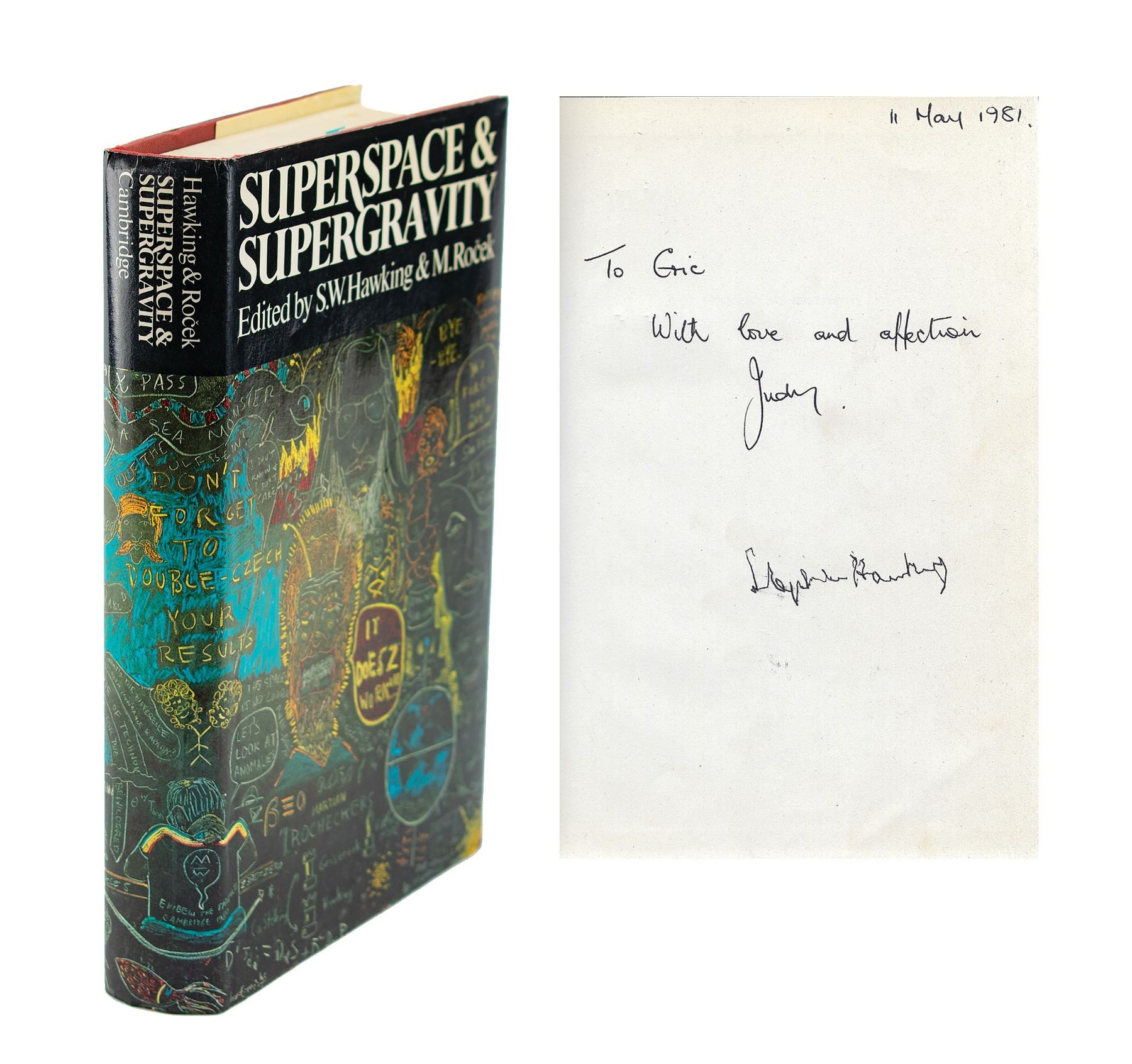 Signed book: Superspace & Supergravity: Proceedings of the Nuffield Workshop, Cambridge, June 16-July 12, 1980. First edition. Cambridge: Cambridge University Press, 1981. Hardcover with dust jacket, 6 x 9, 527 pages. Signed on the first free end page in black ink, "Stephen Hawking," and signed and inscribed by Judy Fella, Hawking's first secretary and later his nursing coordinator, "11 May 1981, To Eric, With love and affection, Judy." In fine condition, with light rubbing to dust jacket extremities. The volume contains a series of mathematical papers on superspace and supergravity presented at the workshop organized by Hawking, and the interesting pictorial dust jacket reproduces a chalkboard doodled on by the attendees: it includes a caricature of Hawking, and his assistant is depicted as 'one of the Fella's.' A fabulous, rarely seen autograph from one of the towering scientific figures of modern times.