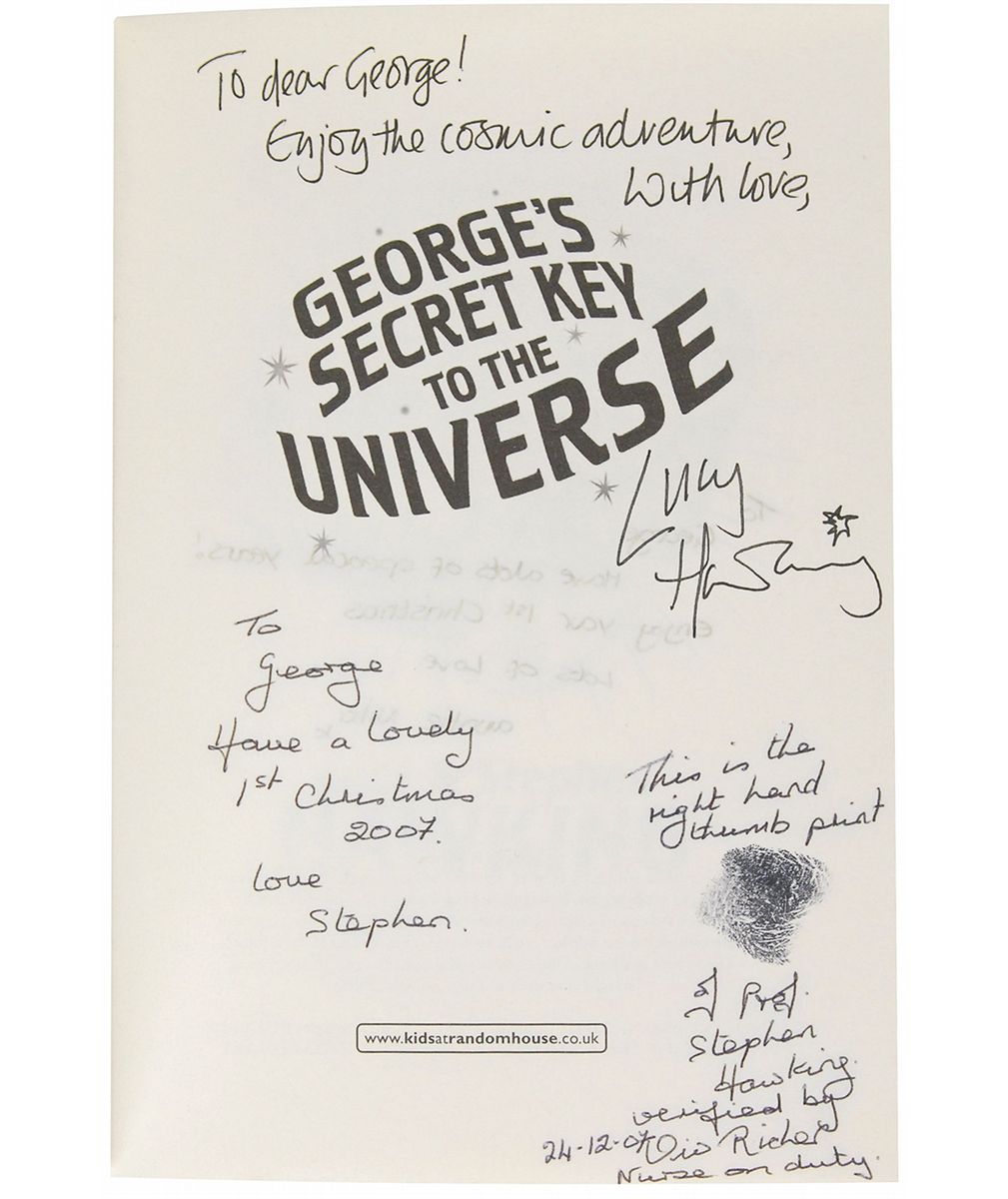Signed book: George’s Secret Key to the Universe. First edition, first printing. London: Doubleday, 2007. Hardcover with dust jacket, 6.5 x 8.75, 295 pages. Signed on the half-title page by Stephen Hawking using his thumbprint, and signed and inscribed in black felt tip by his daughter and co-author, “To dear George, Enjoy the cosmic adventure with love, Lucy Hawking.” Hawking’s nurse added certification surrounding the thumbprint, verifying it as “the right hand thumb print of Prof. Stephen Hawking,” adding the date of December 24, 2007. The aunt of the recipient, another one of Hawking’s caretakers, added an inscription on his behalf, “To George, Have a lovely 1st Christmas, 2007. Love, Stephen.” She also added her own gift inscription on the reverse of the half-title page, “To George, Have a lot of special years! Enjoy your 1st Christmas, Lots of love, Auntie Niki.” In fine condition, with show-through from the gift inscription. Accompanied by a photograph of Hawking holding the baby George in December 2007, as well as a letter of provenance from George’s father, in part: “We know Stephen as my wife’s sister Niki has been one of his carers for 9 years now. In that time my wife has become his hairdresser. Stephen even came to our wedding in August 2008 and a sight I will never forget is seeing Stephen being cared to by one of his carers on a bouncy castle we had provided for the children there, quite a surreal moment seeing a modern day mastermind on a kid’s bouncy castle.” An exceedingly rare piece with superior provenance—the first Hawking we have ever offered!