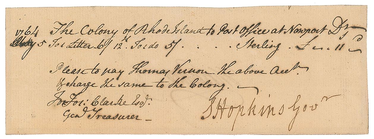 Manuscript DS, signed “S. Hopkins, Gov'r,” one page, 6.25 x 2.25, May 5, 1764. Promissory note issued to Rhode Island Treasurer Joseph Clarke, directing him to pay Thomas Vernon "& charge the same to the Colony." Signed at the conclusion by Stephen Hopkins as governor of Rhode Island. In fine condition.