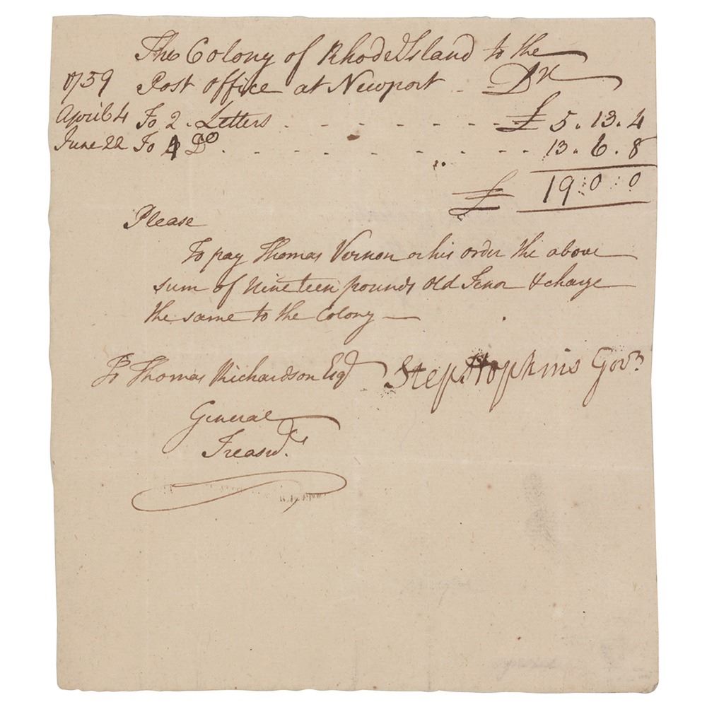 Manuscript DS, signed ‰ÛÏStep. Hopkins, Gov'r,‰Û one page, 5.75 x 6.5, April‰ÛÒJune 1759. Pay order for postage at the Newport Post Office, accounting for letters sent on April 4th and June 22nd, in part: "Please to pay Thomas Vernon or his order the above sum of nineteen pounds Old Tenor & charge the same to the colony." In fine condition.