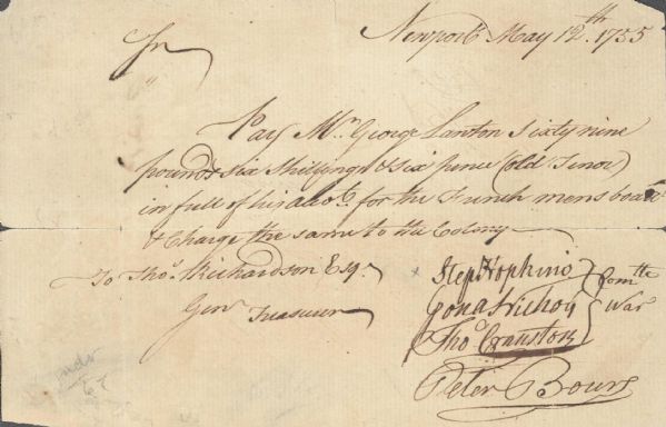 Signer of the Declaration Of Independence Stephen Hopkins Pay Order Signed. One page, 6.5" x 4.25", Newport, May 12, 1755, ordering Thomas Richardson to pay George Lanton "sixty nine pounds six shillings & six pence . . . in full . . . for the French mens boat[?] & charge the same to the colony." Countersigned by Jonas Nichols, Thomas Cranston, and Peter Bours. Smoothed folds with tears and top corners ripped with yellowing.
