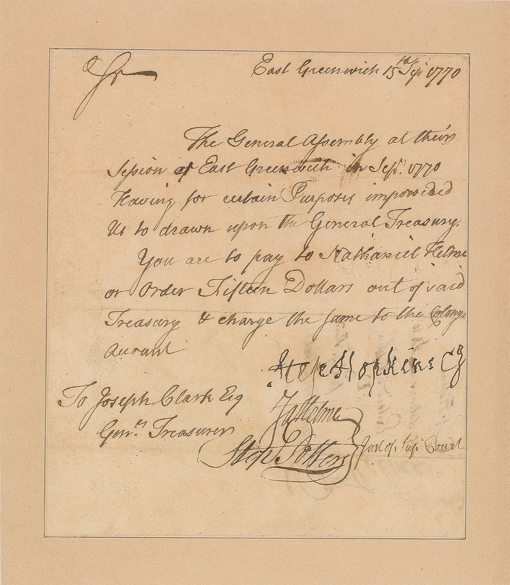 Signer of the Declaration of Independence from Rhode Island (1707–1785) who served as the colony’s governor in the 1750s and 1760s. Manuscript DS, signed “Step. Hopkins CJ,” one page, 6 x 7, September 15, 1770. Pay order submitted to Rhode Island Treasurer Joseph Clark. In part: “You are to pay to Nathaniel Helme or order Fifteen Dollars out of said Treasury & charge the same to the Colony’s account.” Signed at the conclusion by Hopkins as chief justice of the Rhode Island Supreme Court and countersigned by two other justices. Professionally inlaid into a slightly larger sheet. In very good to fine condition.
