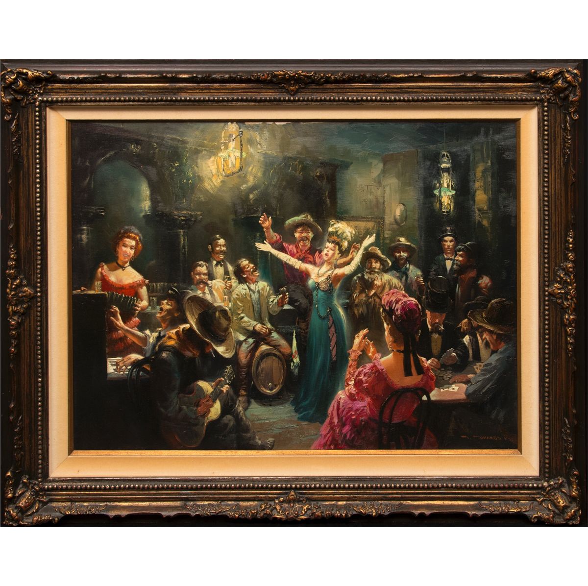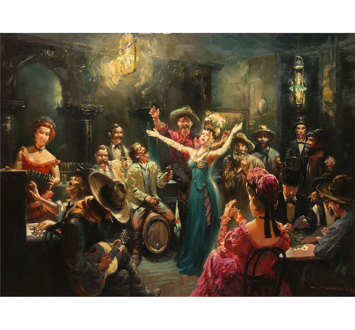 Stephen Juharos (1913 - 2010). Gay Days of Old Jerome. 29" x 39" oil on canvas. Signed lower right: J JUHAROS. Verso: titled on stretcher.